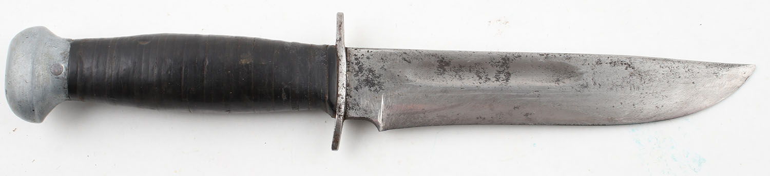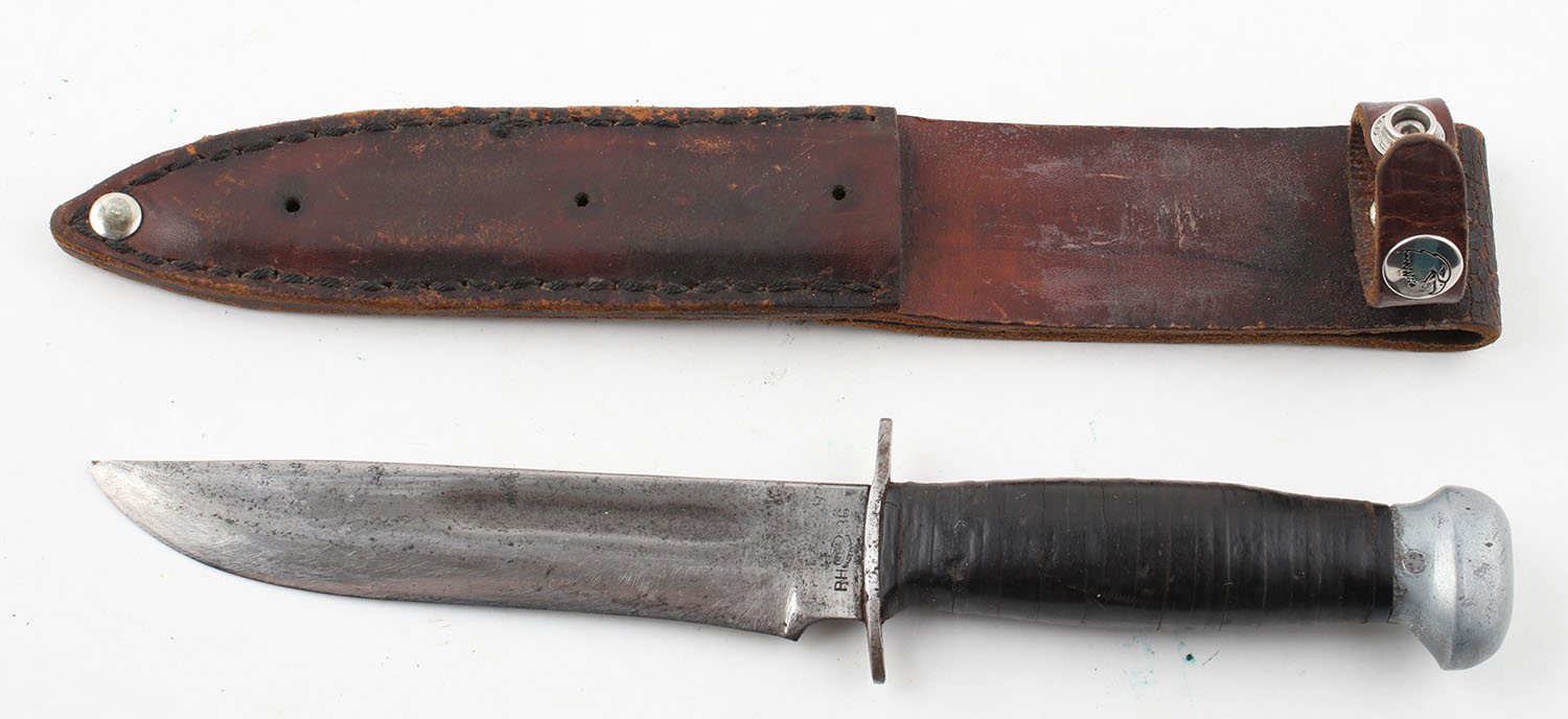 Pal Cutlery Co. knife, RH 36, 5.5'' blade, has leather sheath, has age soiling, given to troops in WWII. Grade: Excellent - Value: 50 to 100