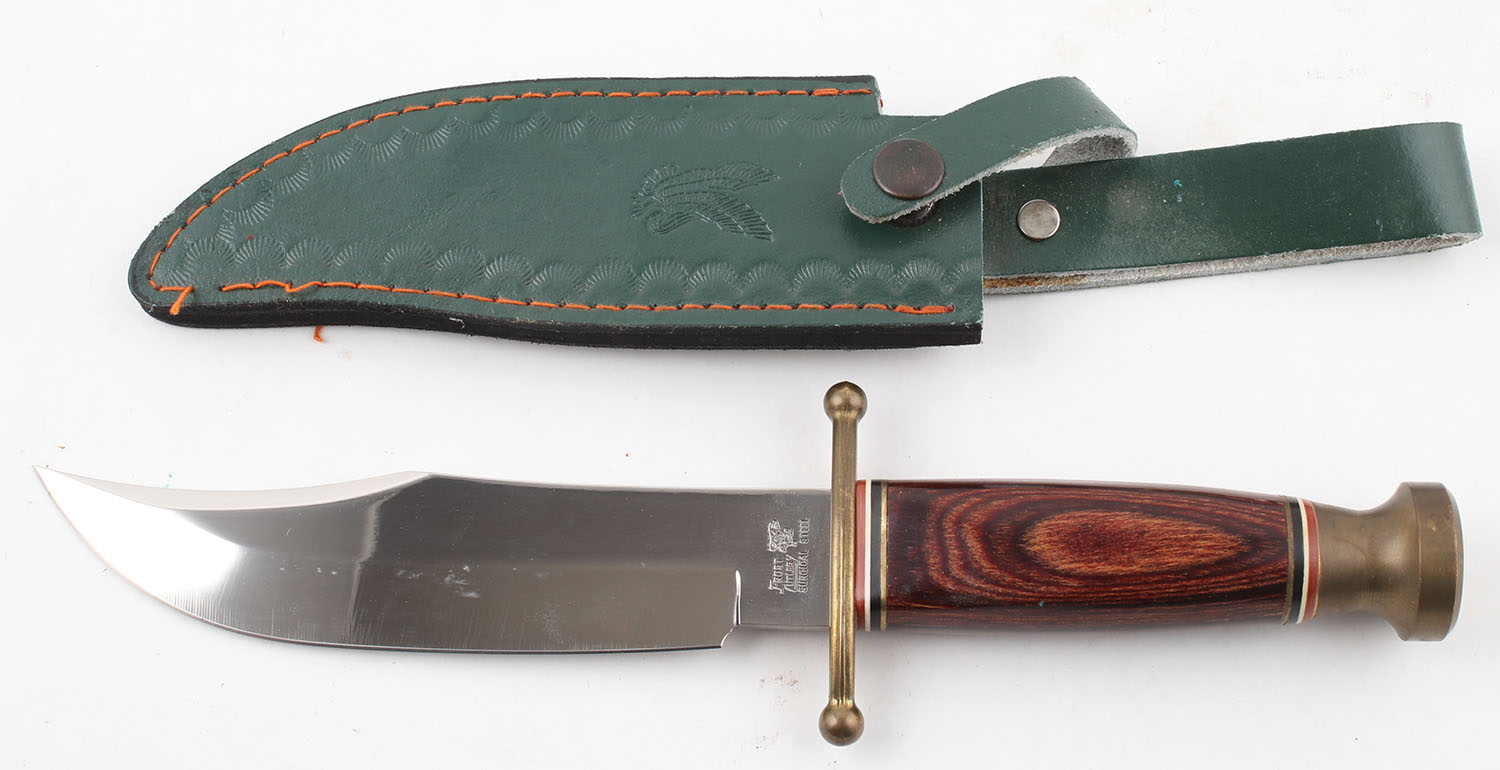 Frost Cutlery knife, fixed 6'' blade, has leather sheath, bright and clean, wood handle. Grade: Excellent ++ - Value: 30 to 90