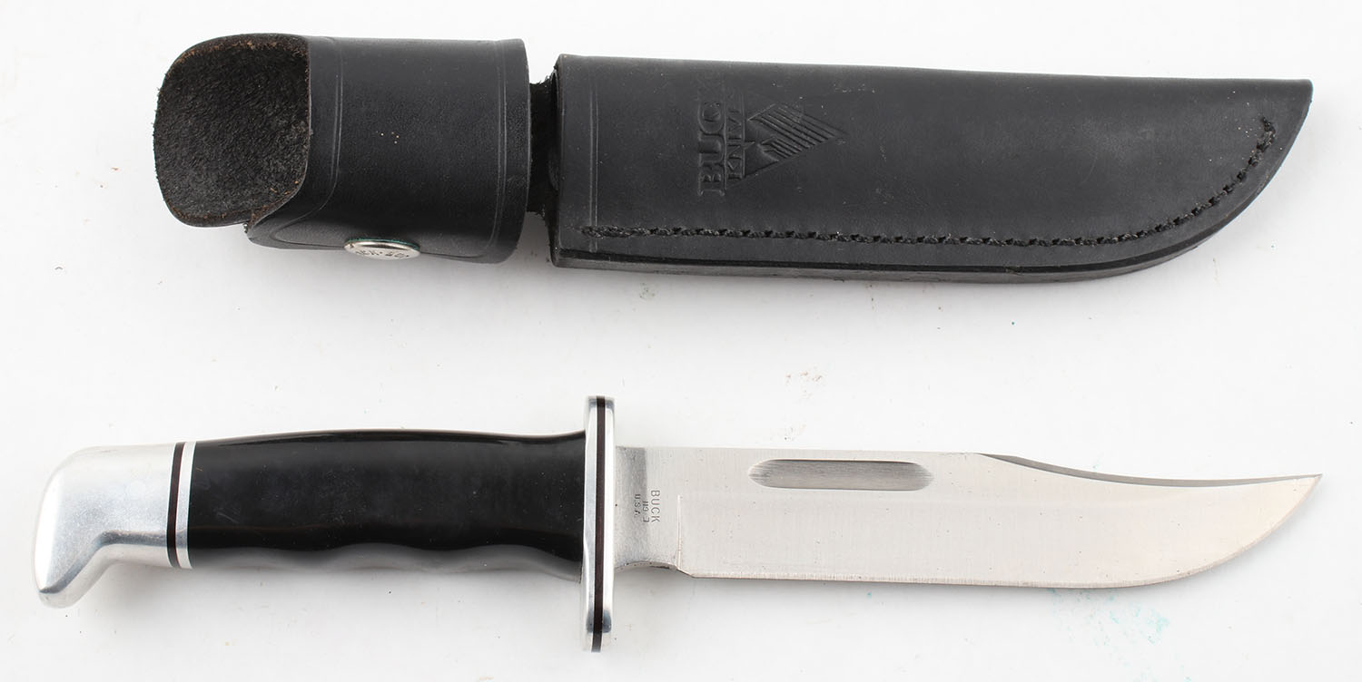 Buck knife, fixed 5.5'' blade, has leather sheath, bright and clean. Grade: Excellent ++ - Value: 30 to 90