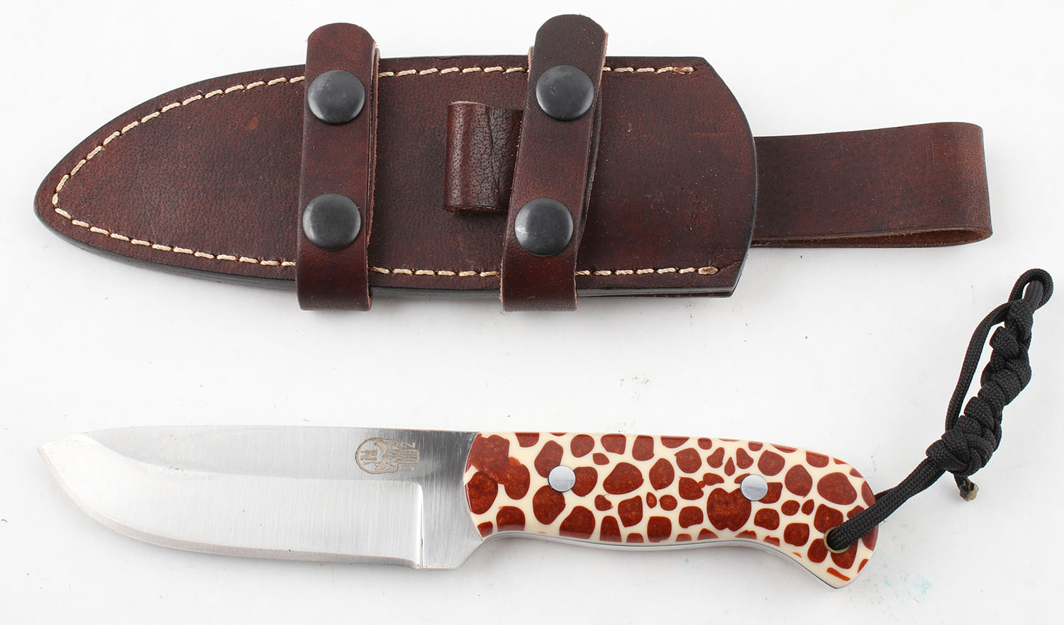 Fixed blade knife, 4'' blade, has leather sheath, bright and clean, blade marked with iPak skull D2 and beautiful handle. Grade: Excellent - Value: 40 to 120
