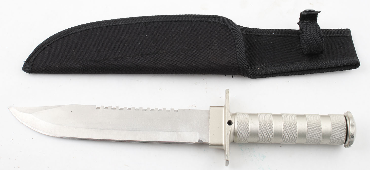Large bowie knife, fixed blade, has sheath, made in China, survival knife with pommel unscrewing to handle compartment 8'' blade. Grade: Excellent - Value: 20 to 100