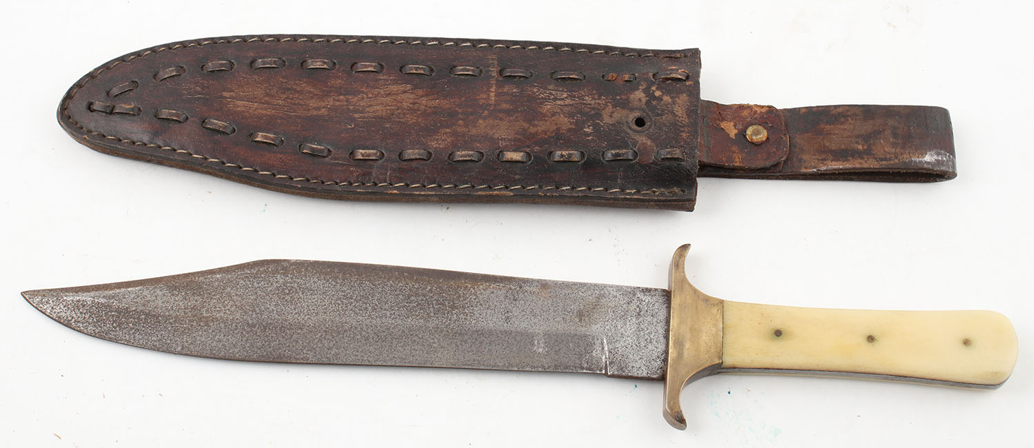 Large unmarked bowie knife, fixed blade, has sheath, 9'' blade. Grade: Very Good ++ - Value: 40 to 100