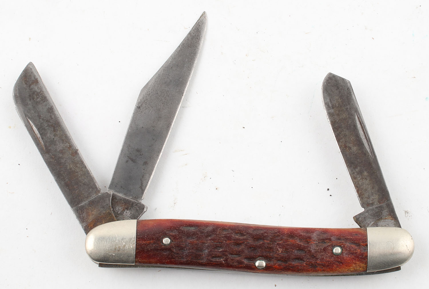 Case knife, 3 folding blades, #6347 HP, 2.5'' longest blade, has age soiling. Grade: Excellent - Value: 20 to 100