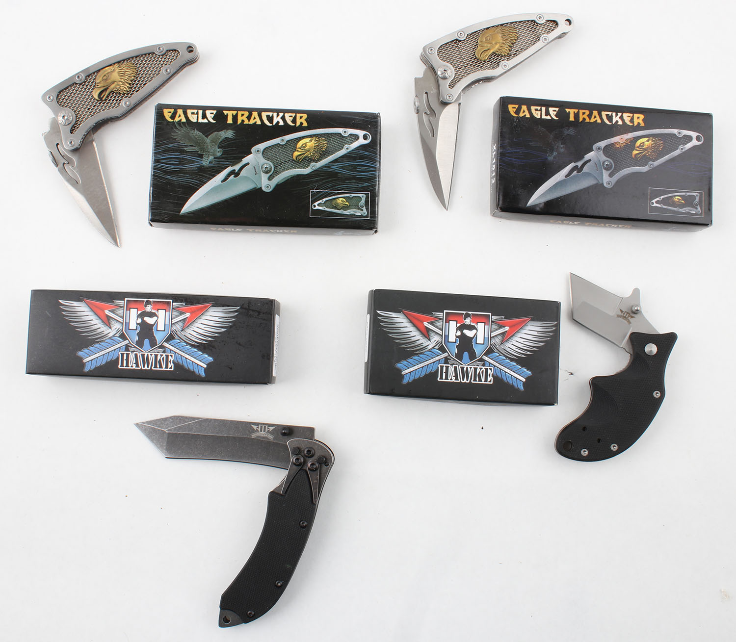 Lot of 4 knives, Hawke and Eagle Tracker, in orignal boxes. Grade: Excellent ++ - Value: 8 to 50