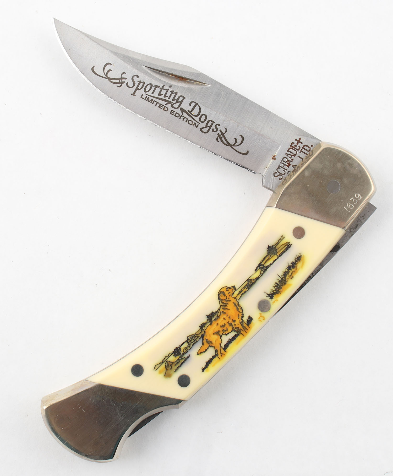 Schrade knife, Sporting Dogs LE, Golden Retriever 1996/97, # 1639, 1 folding blade, 3.25'' blade. Grade: Excellent - Value: 40 to 100