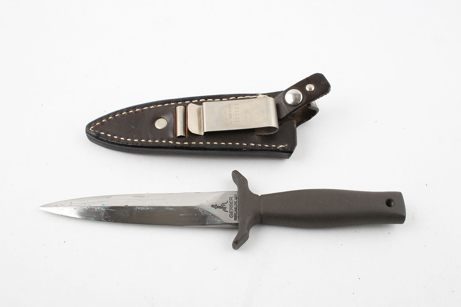 Gerber fixed blade knife, #013443, has leather sheath, very nice! Grade: Excellent ++ - Value: 40 to 150
