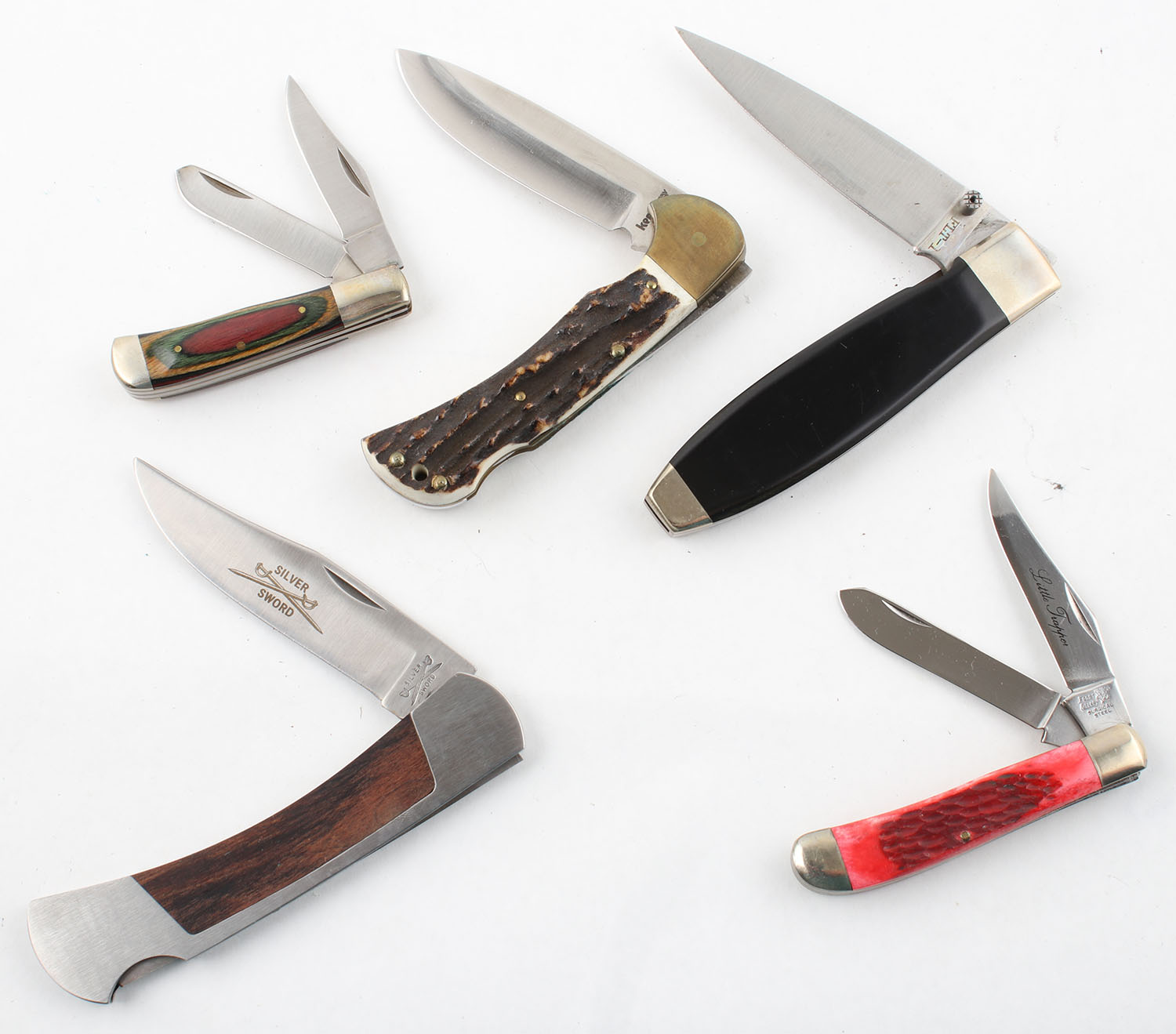 Lot of 5 folding blade knives, all different all solid. Grade: Excellent - Value: 40 to 90