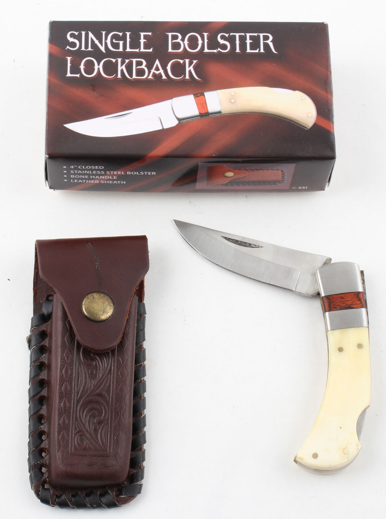 Single bolster lock back folding blade knife, has leather sheath and original box, all solid. Grade: Excellent ++ - Value: 16 to 50