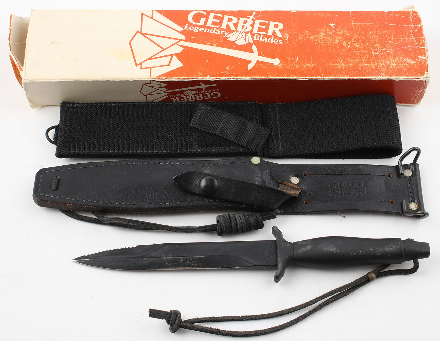Gerber knife, Commando II blackened blade, 6'' blade, #A8019S, has sheath and orignal cardboard box. Grade: Excellent ++ - Value: 50 to 150