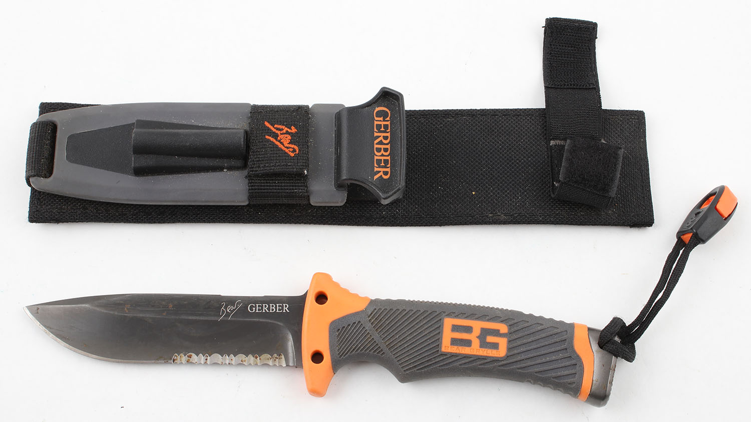 Gerber knife, Bear Grylls, 4'' blade, has sheath and orignal cardboard box. Grade: Excellent ++ - Value: 16 to 50