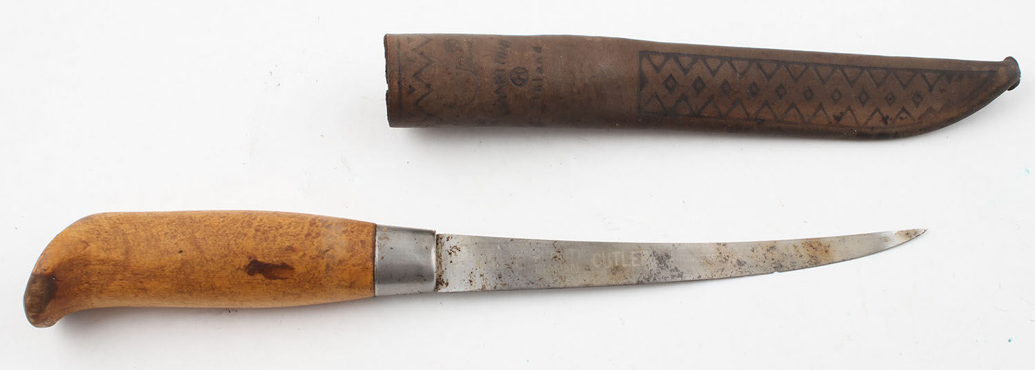 Vintage J. Martini Finland signed fish knife with leather sheath, 10.75 OAL. Grade: Very Good ++ - Value: 10 to 40