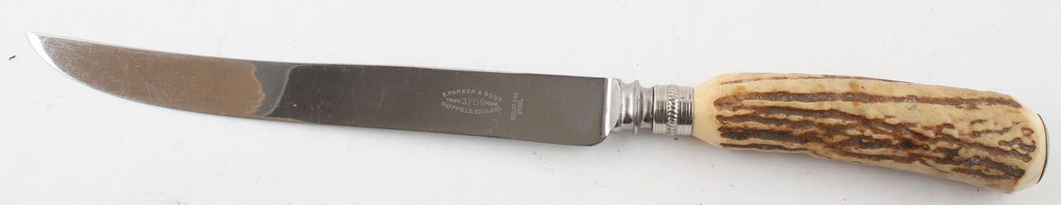 Vintage E. Parker & Sons Sheffield England bone handle knife 13.5'' OAL silver butt plate. Grade: Excellent - Value: 20 to 60