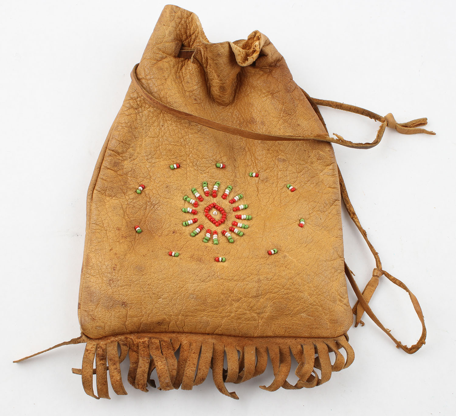 Vintage native american leather pouch, has tobacco, beaded on both side. Grade: Excellent - Value: 20 to 80