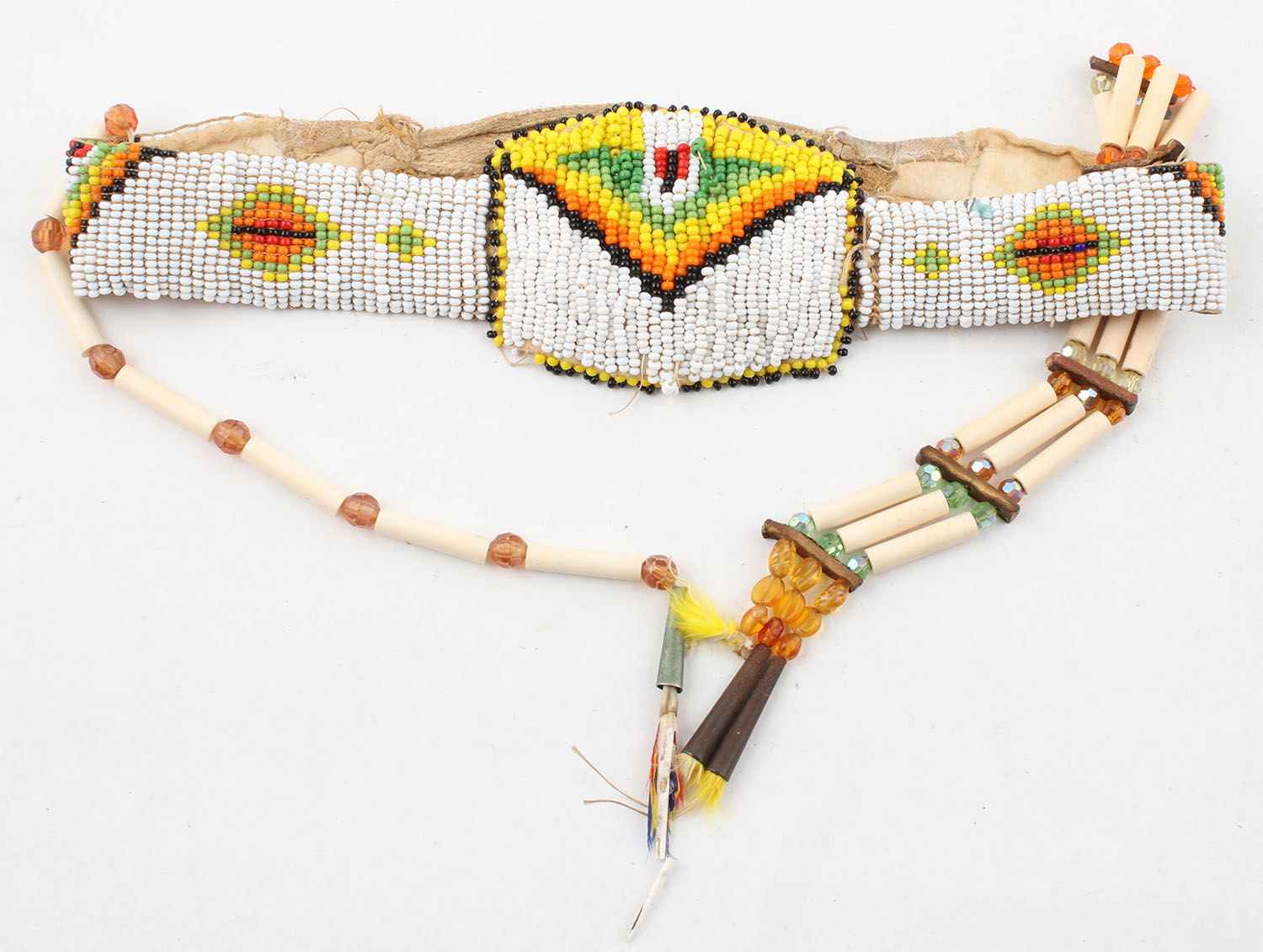 Ponca Native American (Oklahoma) fully beaded regalia head band with 2 bone and glass cut beads drops and brass cone jangles. Brain tanned deer hide, C 1915, used during the 101 ranch wild west shows. Grade: Excellent - Value: 50 to 250