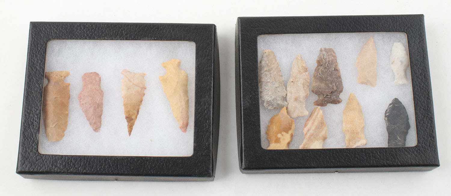 Lot of 13 Native American Arrowheads, in glass case, all bright and clean. Grade: Excellent - Value: 50 to 200