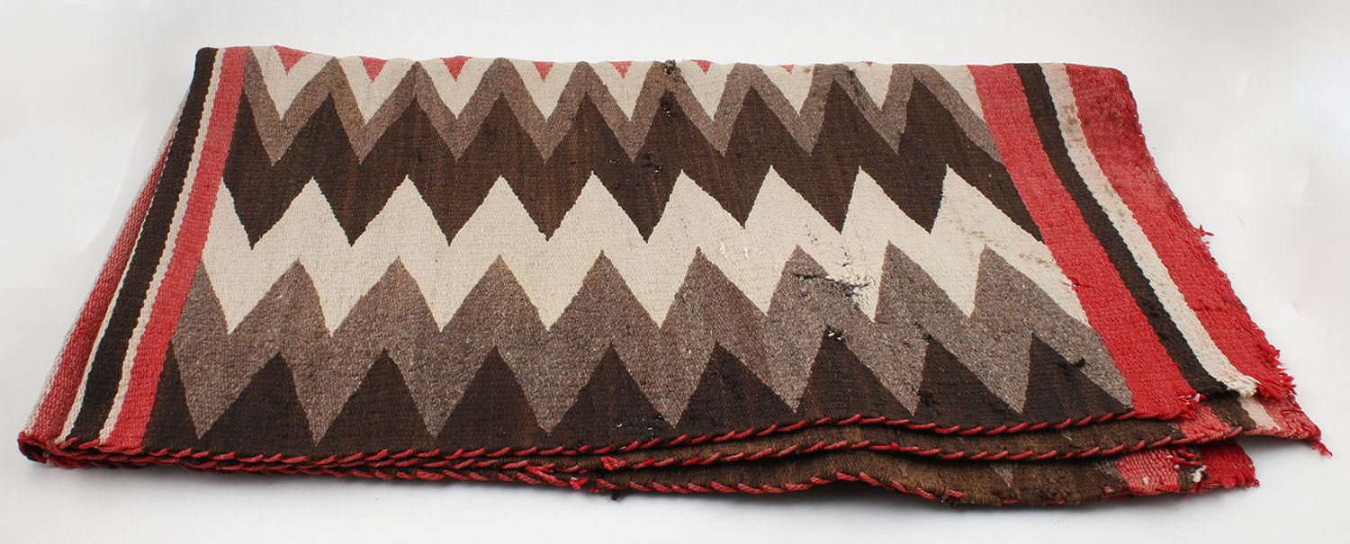Old Navaho Native American blanket circa 1910 with honest use, 63'' x 37'', Nice Colors with minor fraying on couple corners from actual use. Dye Colors are wonderful as is the design, Bought directly from a Navaho family in about 1975. This was used by their grandparents in their home since it was made. Grade: Very Good - Value: 200 to 500