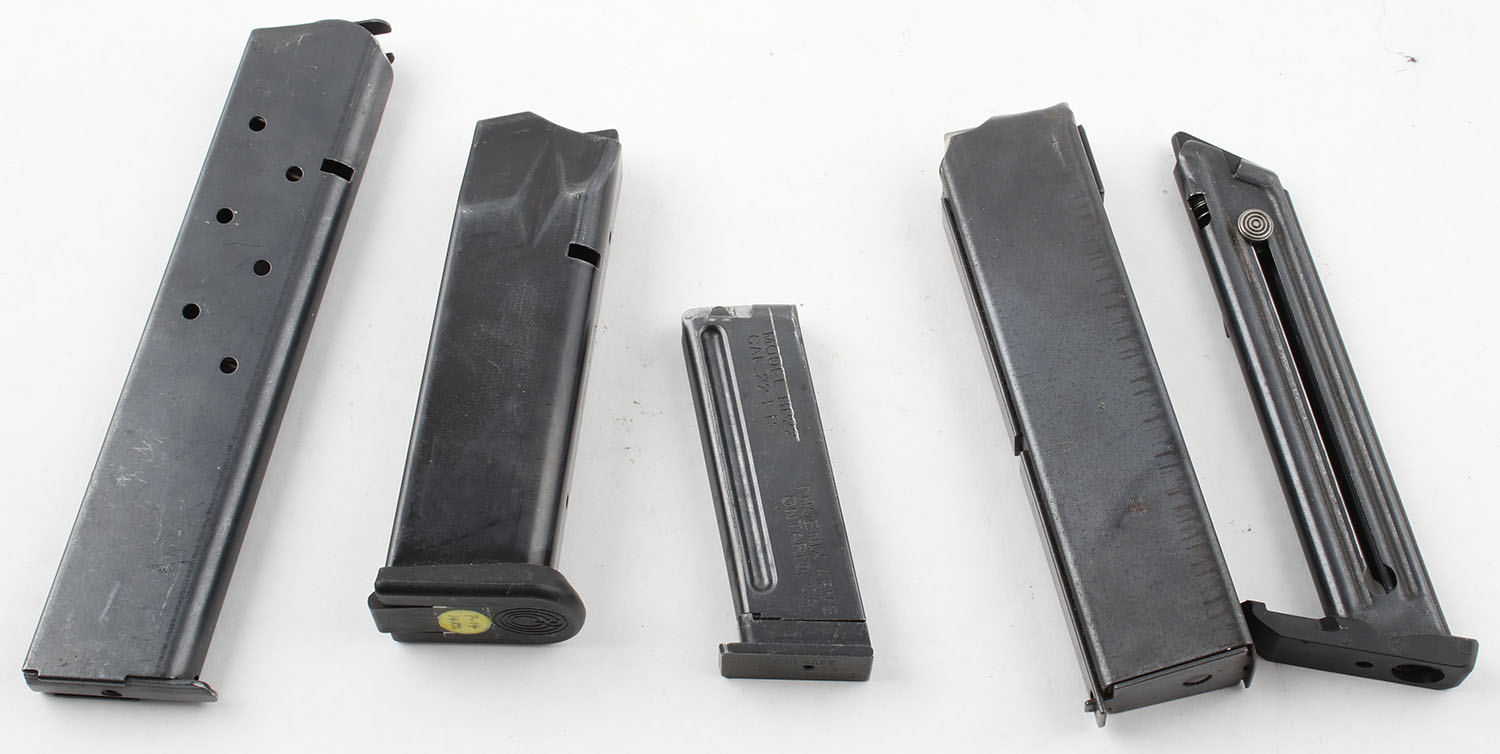 Lot of 5 pistol mags, .22 LR and other large calibers. Grade: Excellent - Value: 40 to 100