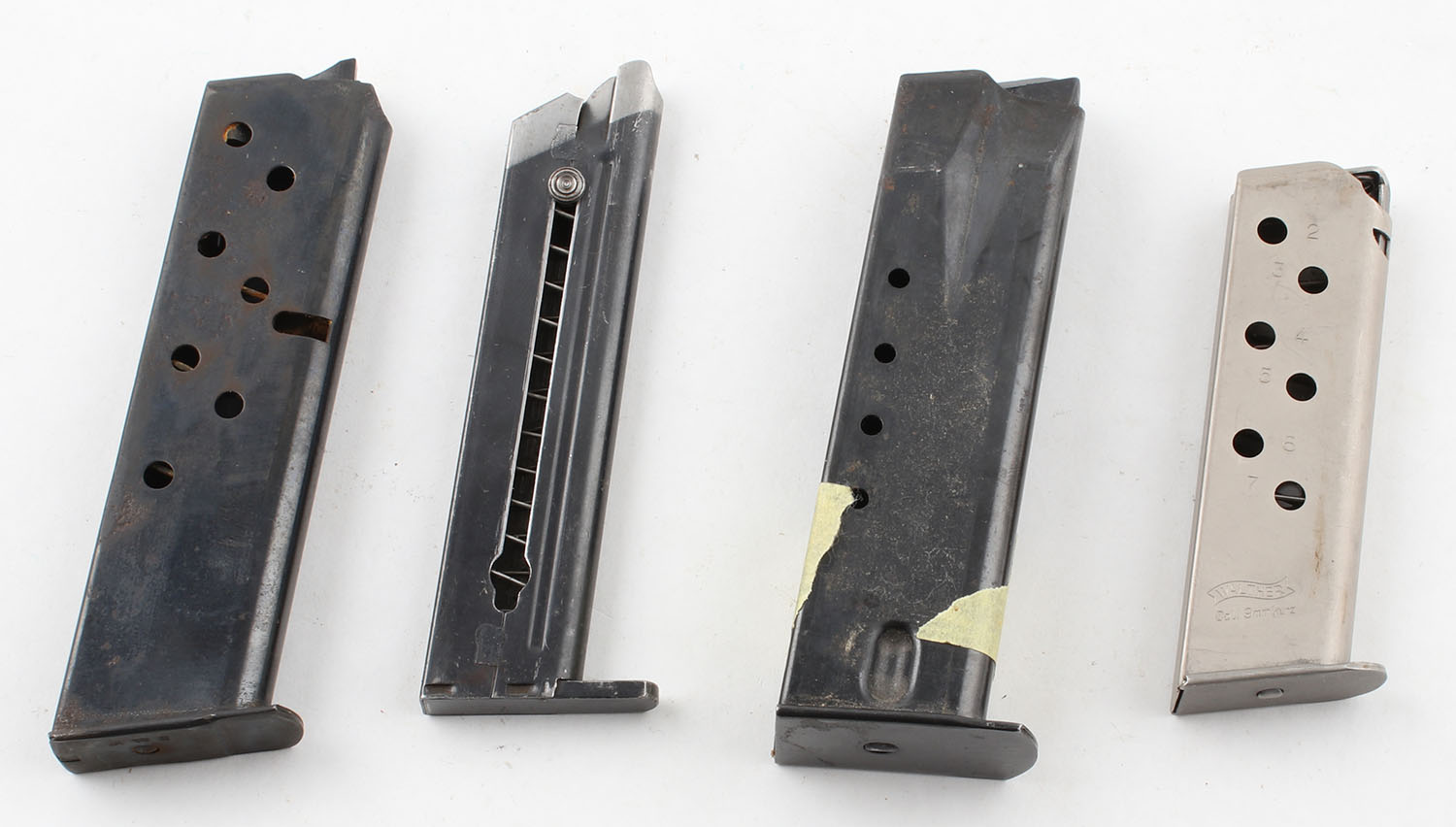 Lot of 4 pistol mags, .380 acp, .22 cal. 40 S&W? and 45acp?. Grade: Excellent - Value: 16 to 60