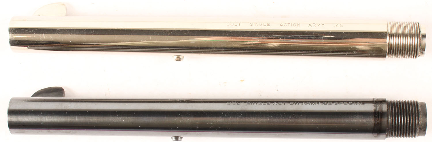 Lot of 2 Colt SAA pistol barrels, 7.5'' OAL, strong rifling, .38 Spec. 1st/2nd 20TPI and .45 cal 2nd 24 TPI. Grade: Excellent ++ - Value: 100 to 250