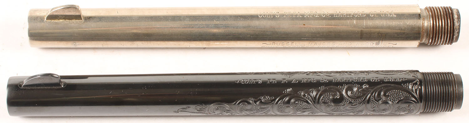 Lot of 2 Colt pistol barrels, 7.5'' OAL, strong rifling, .45 cal Pony express model and .44-40 Engraved 2nd 24TPI. Grade: Excellent ++ - Value: 100 to 300
