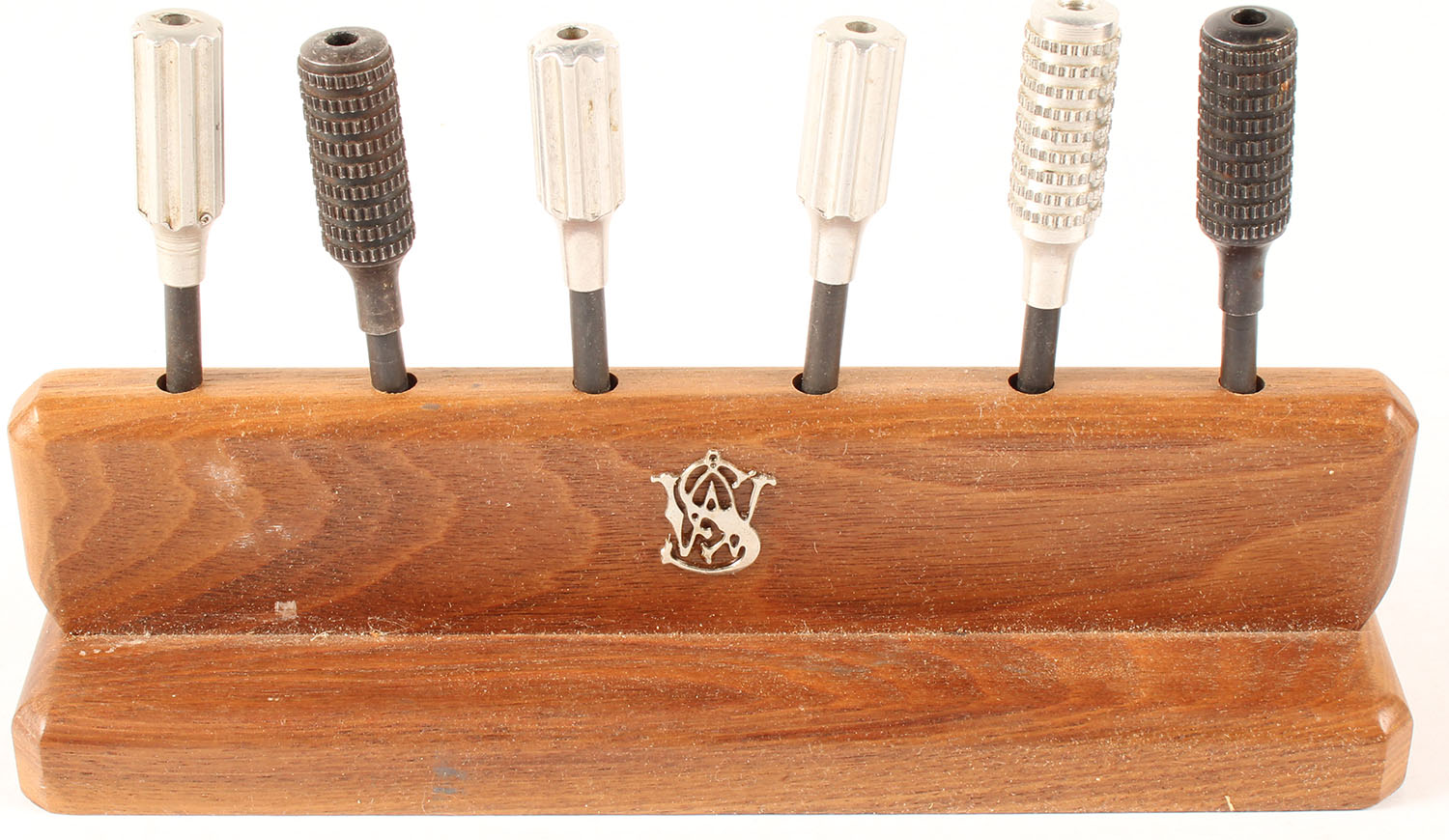 Smith & Wesson Flathead Scredriver set, 6 flathead screwdrivers in wood stand. Grade: Excellent - Value: 20 to 300