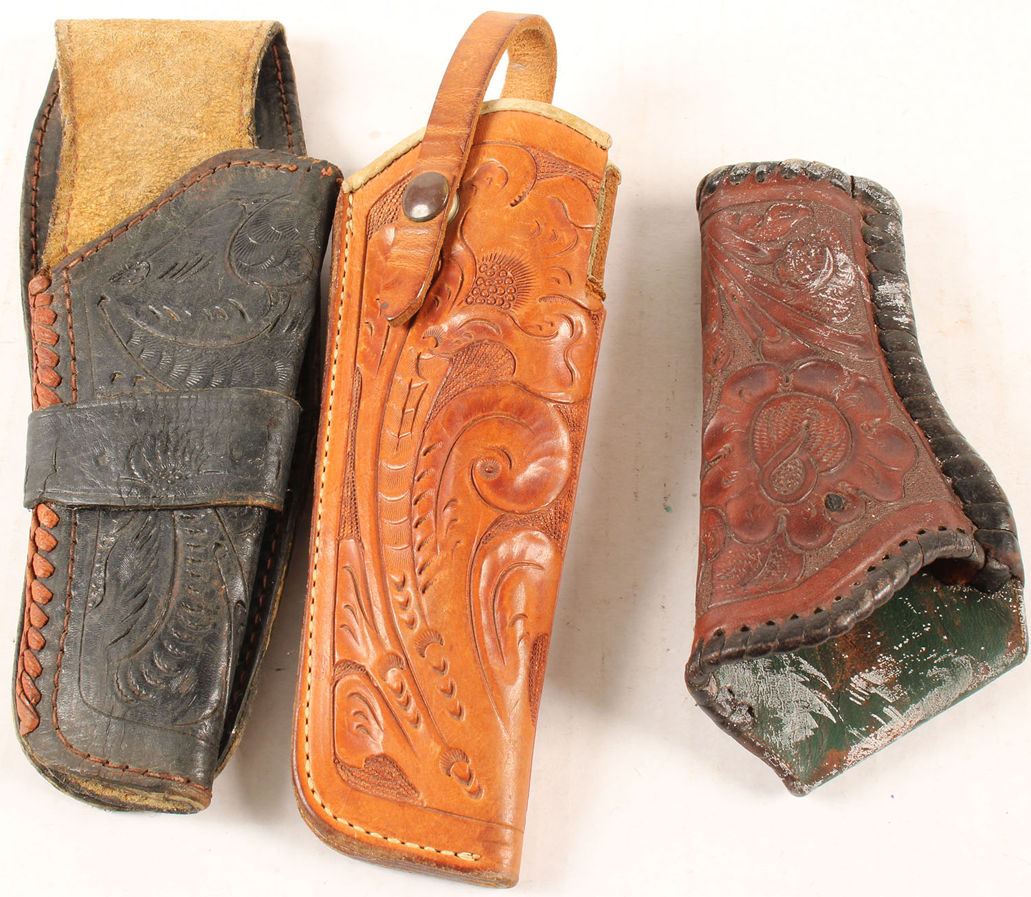 Lot of 3 leather pistol holster with beautiful tooling. Grade: Very Good ++ - Value: 30 to 90