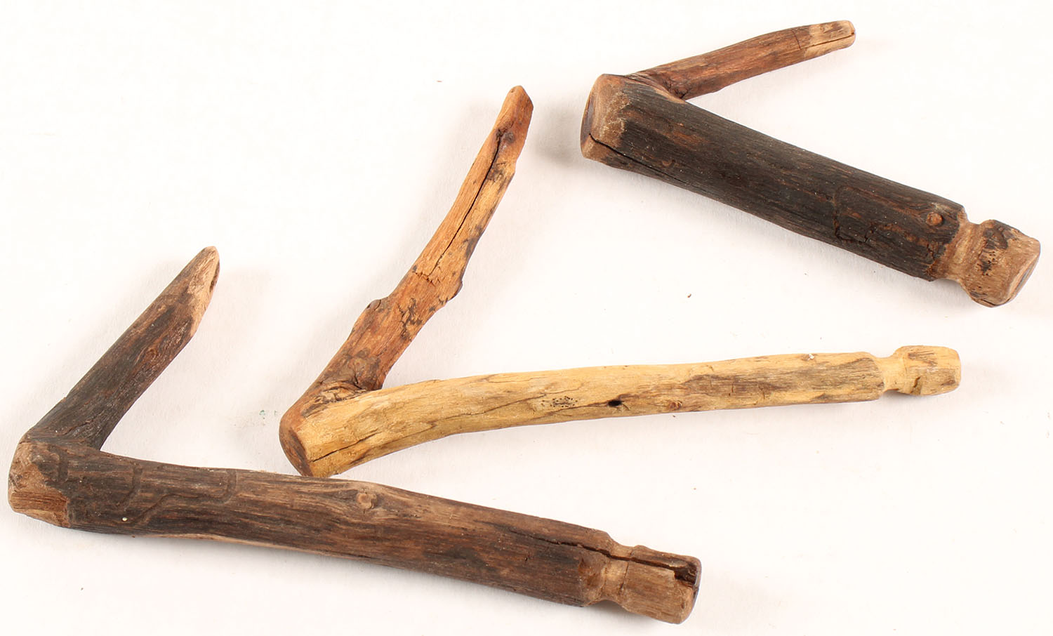 3 very old Native wood halibut fishing hooks found on the beach of the Bering Straights Alaska about 1960. Grade: Excellent - Value: 20 to 120