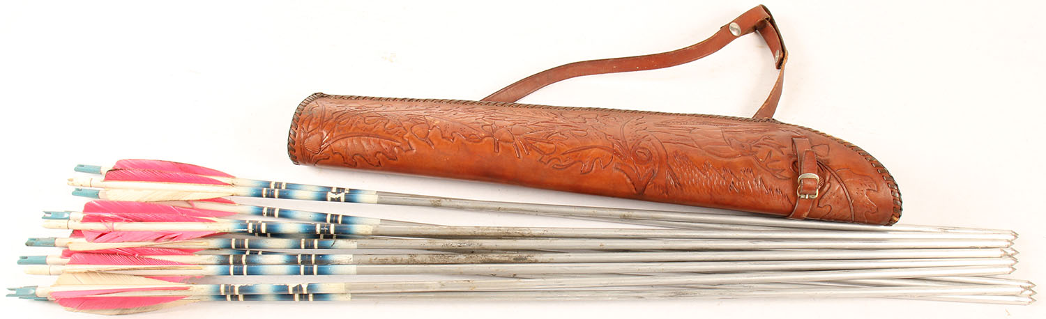 Lot of modern arrows in leather quiver, quiver has detailed tooling to leather. Grade: Excellent - Value: 50 to 200