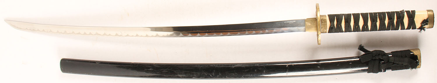 Modern Katana, 32'' blade length, beautiful handle, wood sheath. Grade: Excellent - Value: 40 to 200