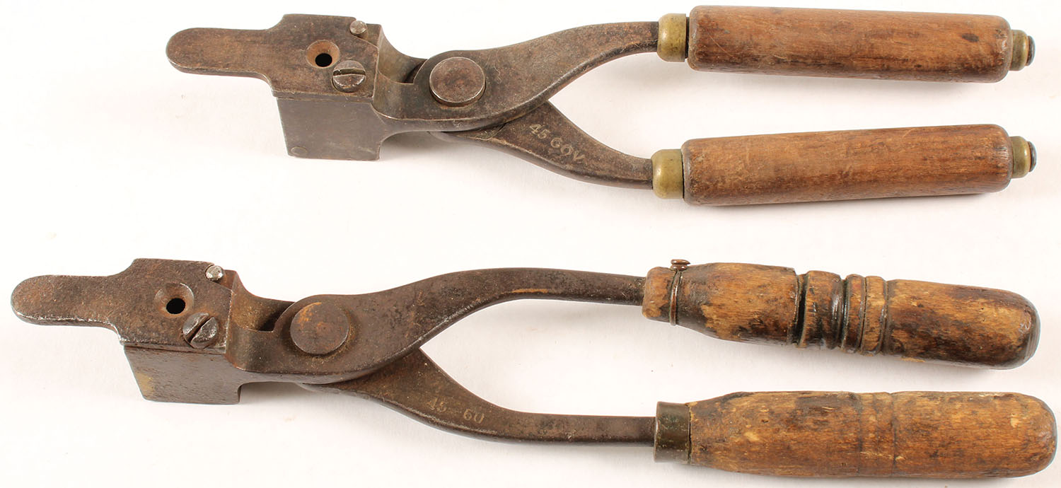 Lot of 2 Winchester reloading tool, single cavity grooved bullet molds, .45 Gov. and .45-60 cal, both have age soiling. Grade: Very Good - Value: 40 to 80