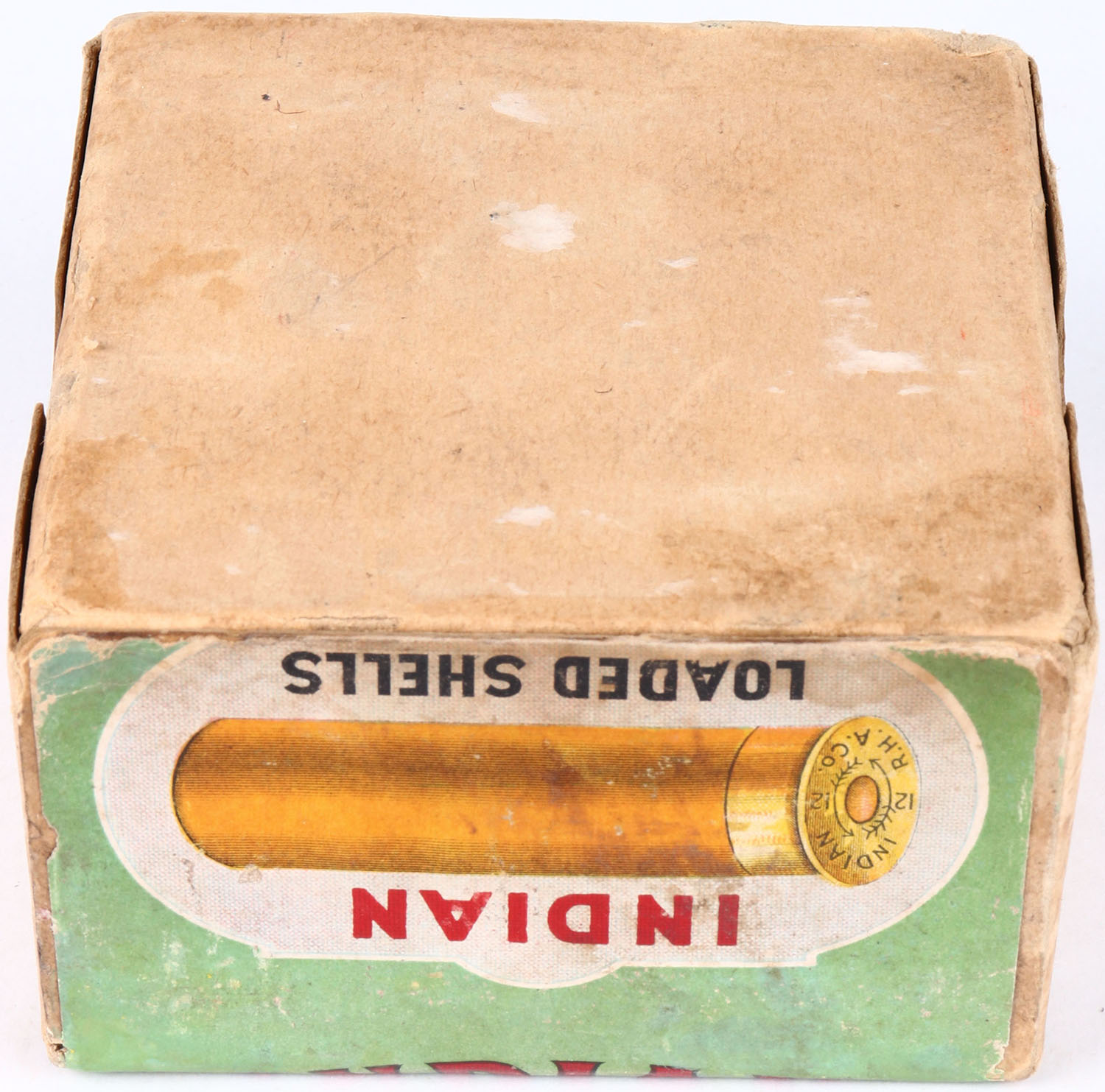 Robin Hood Ammunition Co., INDIAN BLACK POWDER, 12ga., 2pc., Empty, shot size 8, buff box with green, red, white & black label that pictures a multi colored Chief in full head dress, Loading: 3 Drs. 1 Oz. No. 8, box and label have been professionally touched up, box and label are clean & vibrant! VERY RARE BOX! Grade: Excellent + - Value: 2500 to 8000
