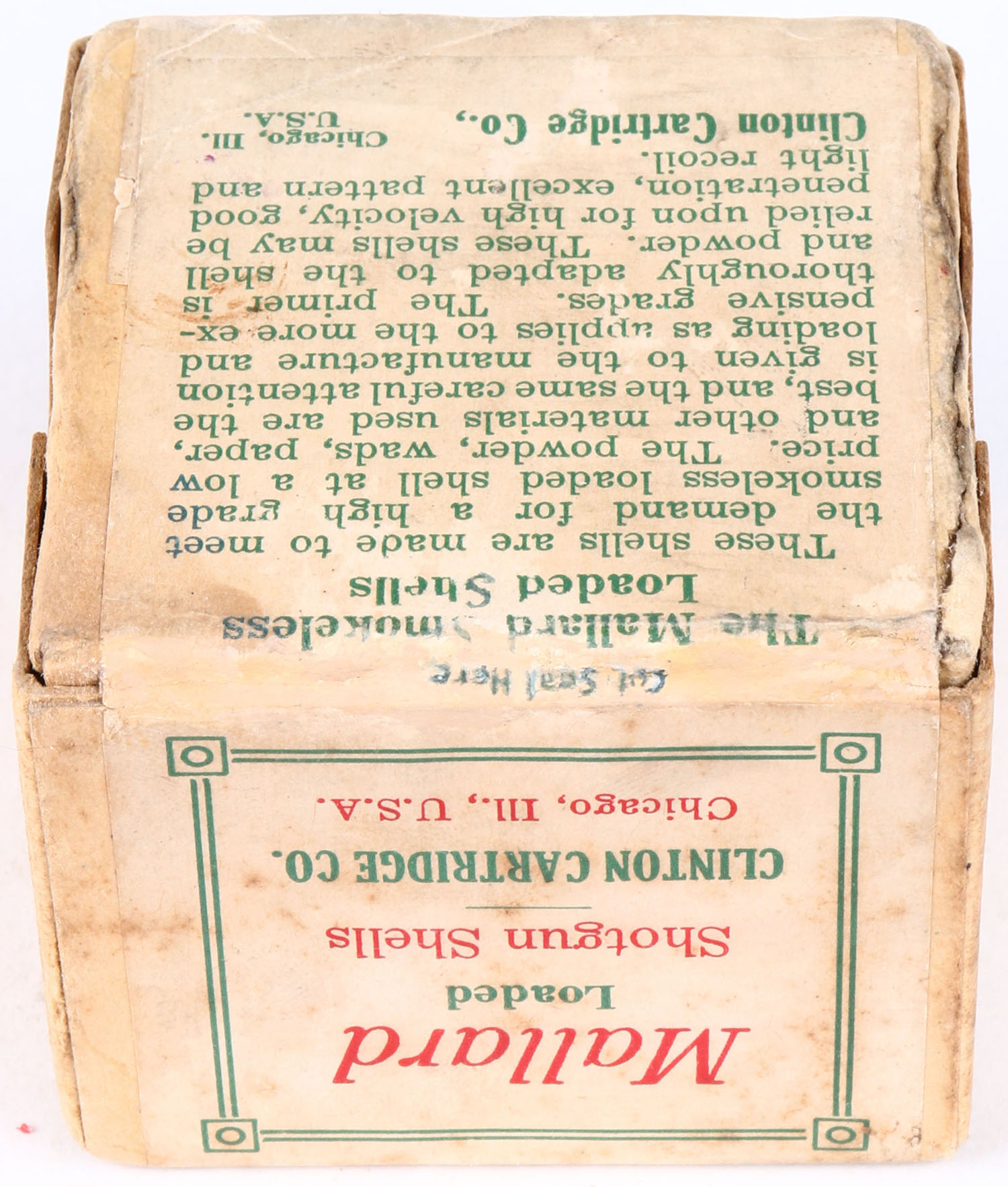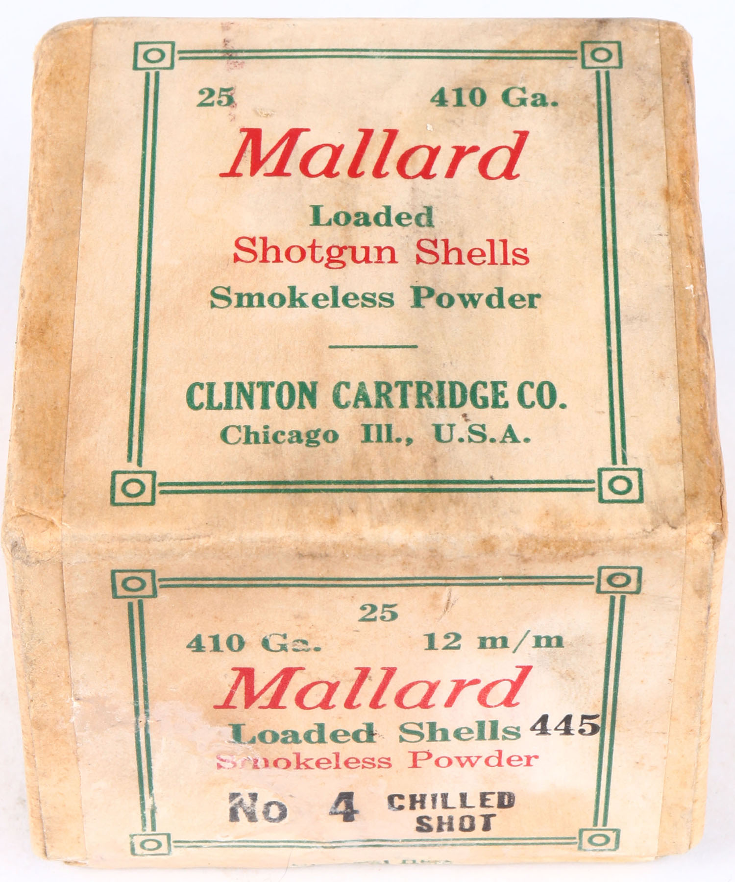 Clinton Cartridge Co., MALLARD, 410ga., 2pc., FULL & SEALED, shot size 4 Chilled, buff box with buff, green & red label, solid box with great color to label has light age soiling, VERY RARE BOX!* Grade: Excellent + - Value: 800 to 4000