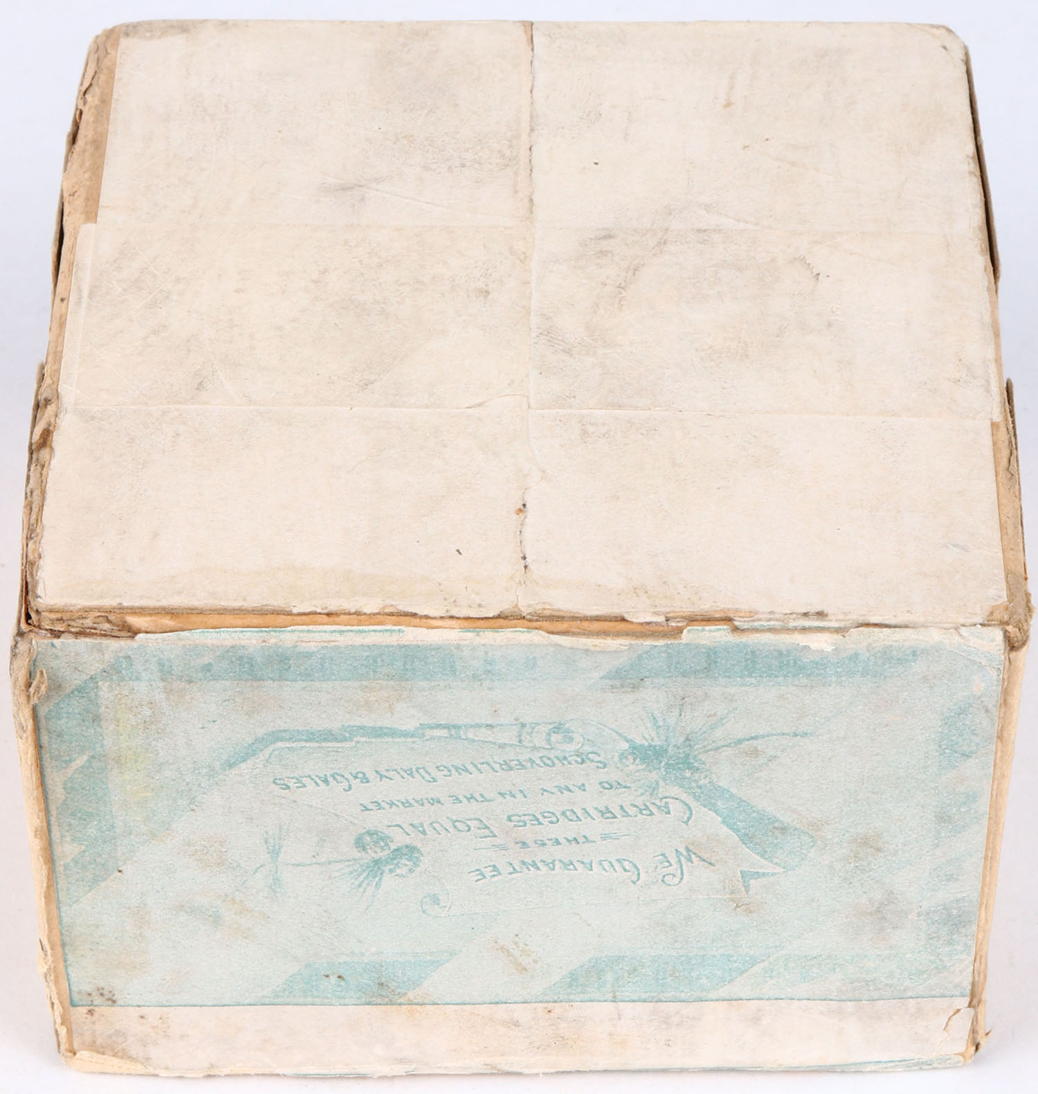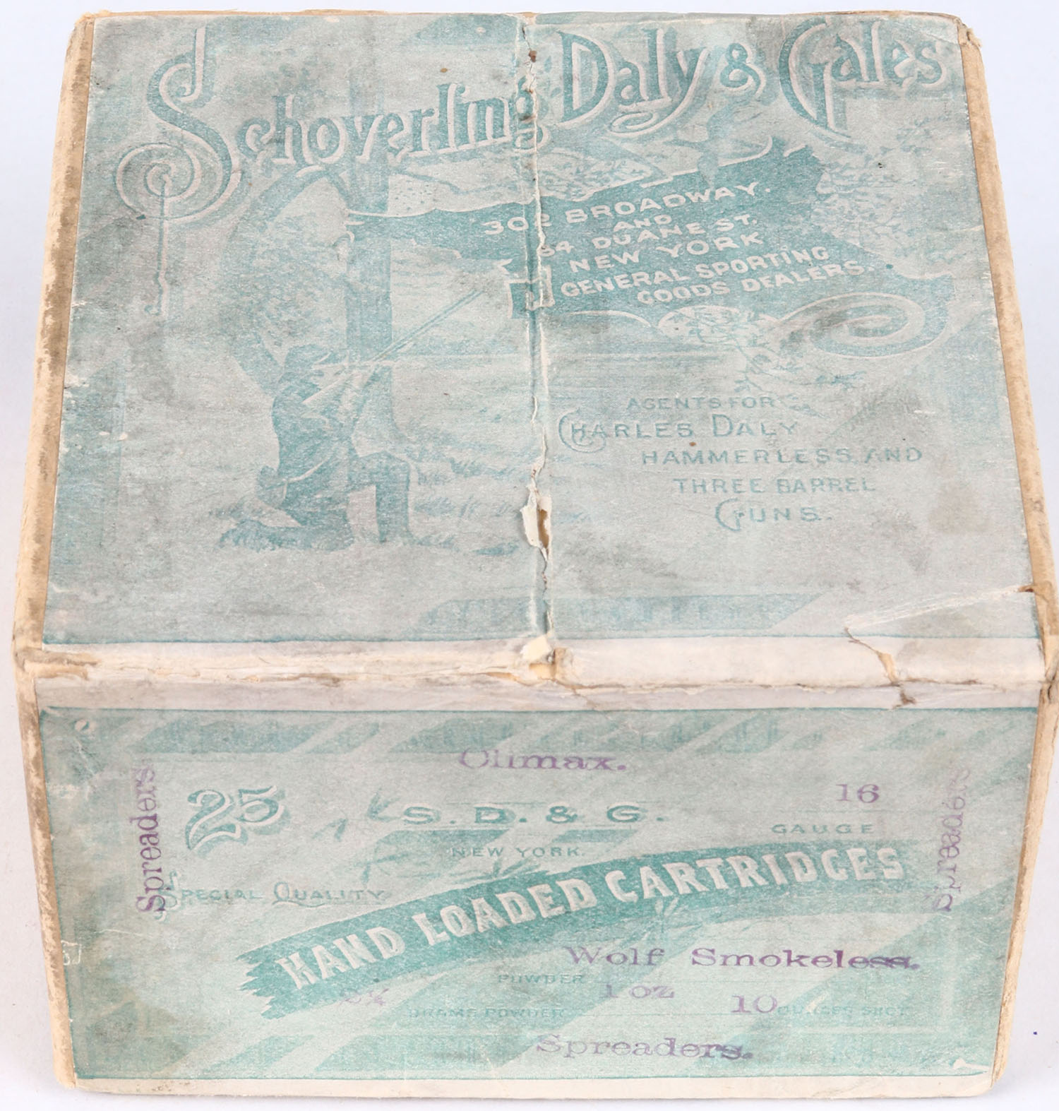 Schoverling Daly & Gales, Hand Loaded Cartridges, 16ga. Wolf Smokeless, 2pc., Full, shot size 10. Buff box with blue & green label that pictures Hunter aiming at birds, box is solid with small glue repair and tape repair, label is solid with light age soiling. Shells are very good.* Grade: Excellent + - Value: 400 to 1500
