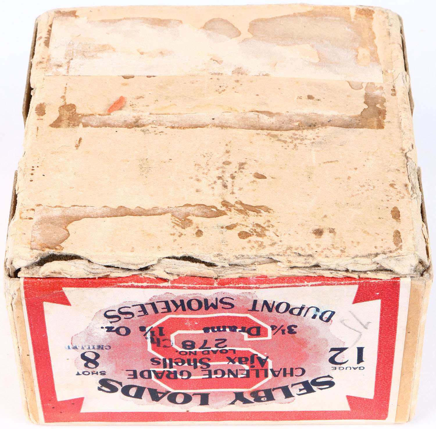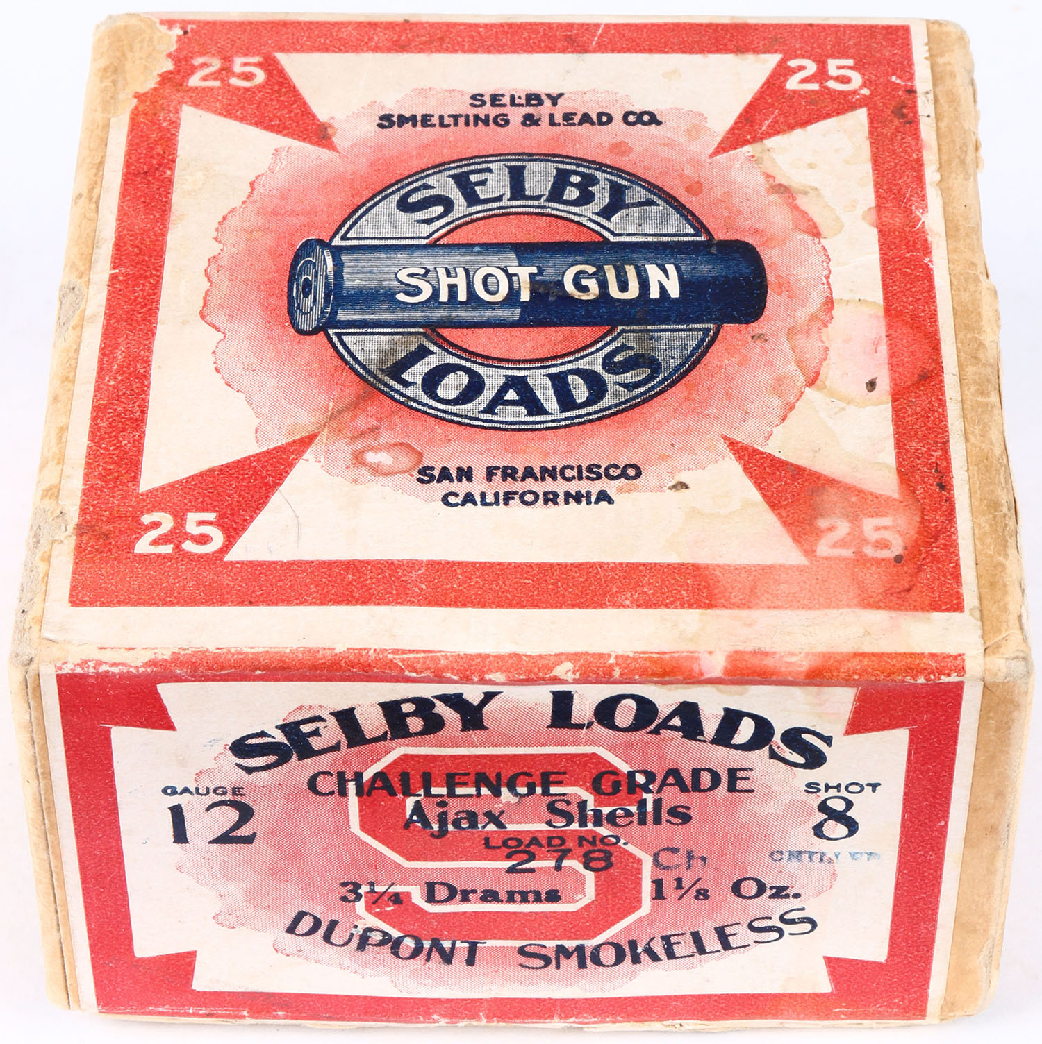 SELBY, Selby Smelting & Lead Co., Selby Shot Gun Loads, Challenge Grade Ajax Shells, 12ga, 2pc., Empty, shot size 8, buff box with blue, red & white paper label, box has seam splits, soiling, no bottom label, nice colors. Grade: Very Good ++ - Value: 60 to 200