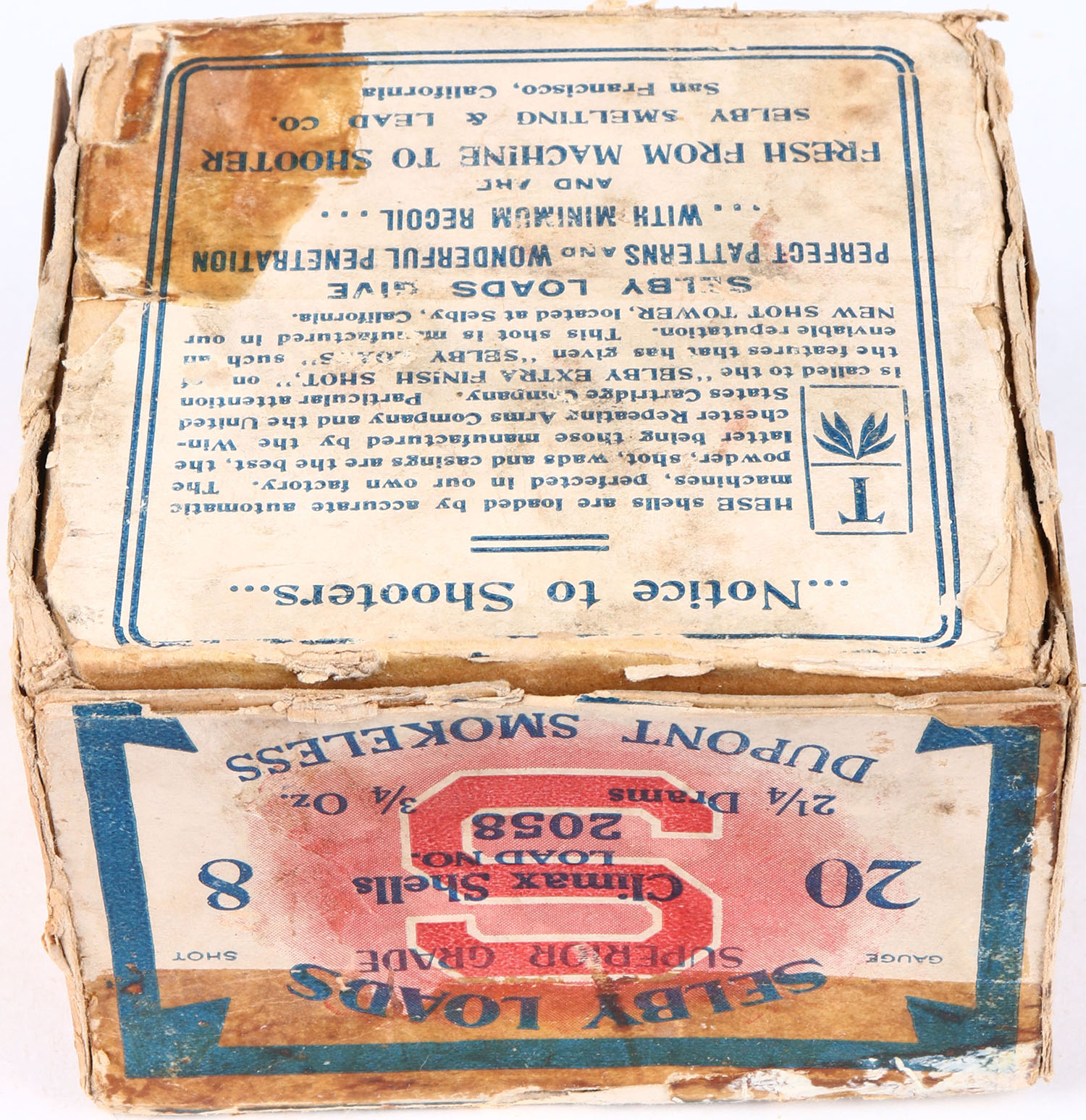SELBY, Selby Smelting & Lead Co., Selby Shot Gun Loads, Superior Grade Climax Shells, 20ga, 2pc., Full, shot size 8, buff box with blue, red & white paper label, box has seam splits, soiling, tape repair & nice colors. Shells are excellent. Grade: Very Good ++ - Value: 60 to 200
