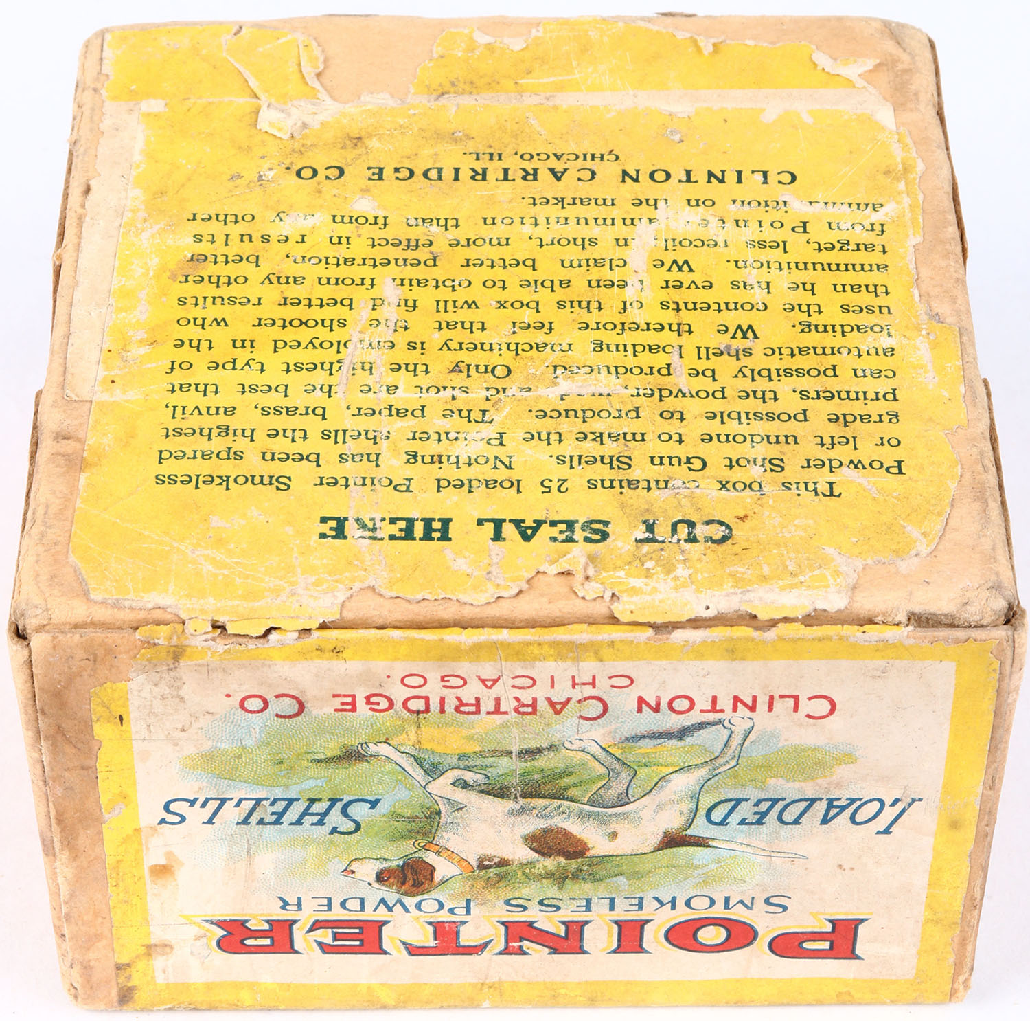CLINTON Cartridge Co., POINTER, 10ga., 2pc., Partial 24rds with 15 being correct, shot size 6, buff box with multi-colored label of a dog holding a quail, box has nice color with age soiling, sides picture crossed shells & a dog on point, Shells are very good with shell protrusions. Grade: Excellent + - Value: 300 to 800