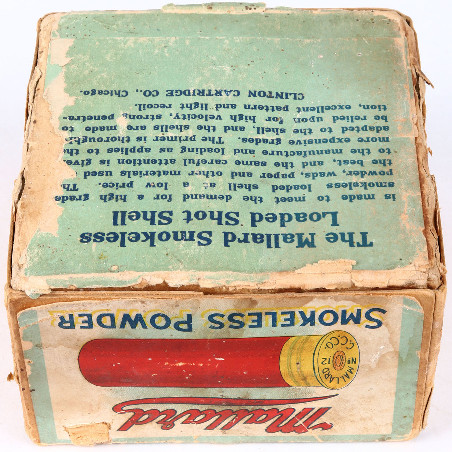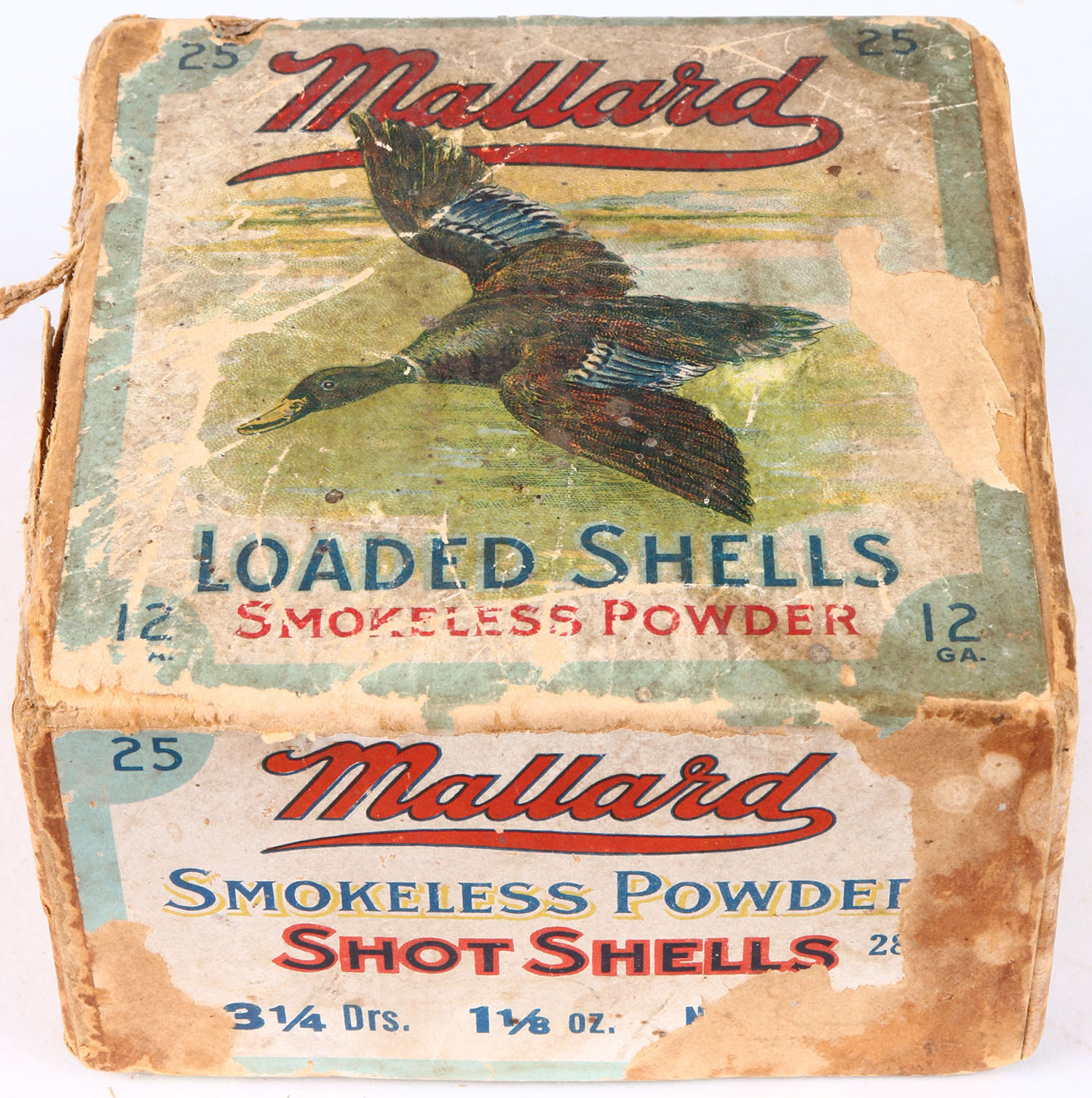 Clinton Cartridge Co., MALLARD, 12ga., 2pc., Full of different shot sizes, shot size ?, buff box with multi colored label picturing a Mallard flying left, 3 1/4 Drs. 1 1/8 Oz., box has seam split with age soiling & label is nice, shells are very good. Grade: Very Good + - Value: 100 to 600