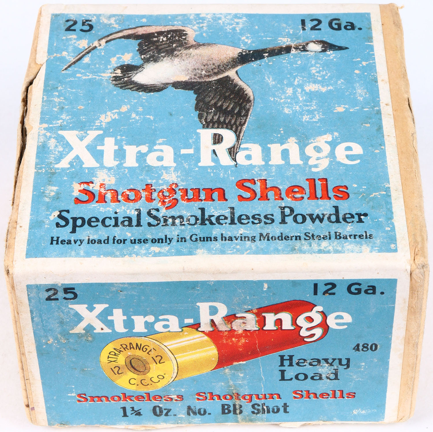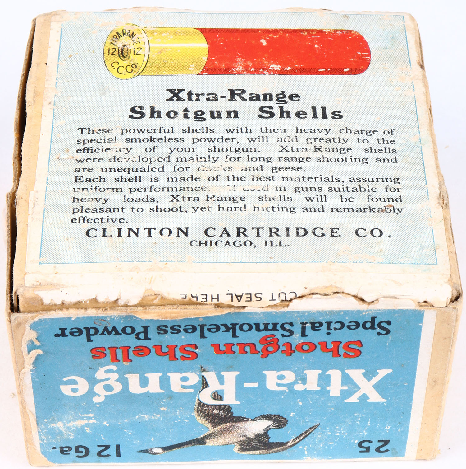 Clinton Cartridge CO., XTRA-RANGE, 12Ga., 2pc., Full, Heavy Load, shot size BB Shot, buff box with multi colored label that pictures a Goose flying, box has seam split, tears, & shell protrusion with soiling & light scuffing, shells are good. Grade: Very Good ++ - Value: 200 to 500