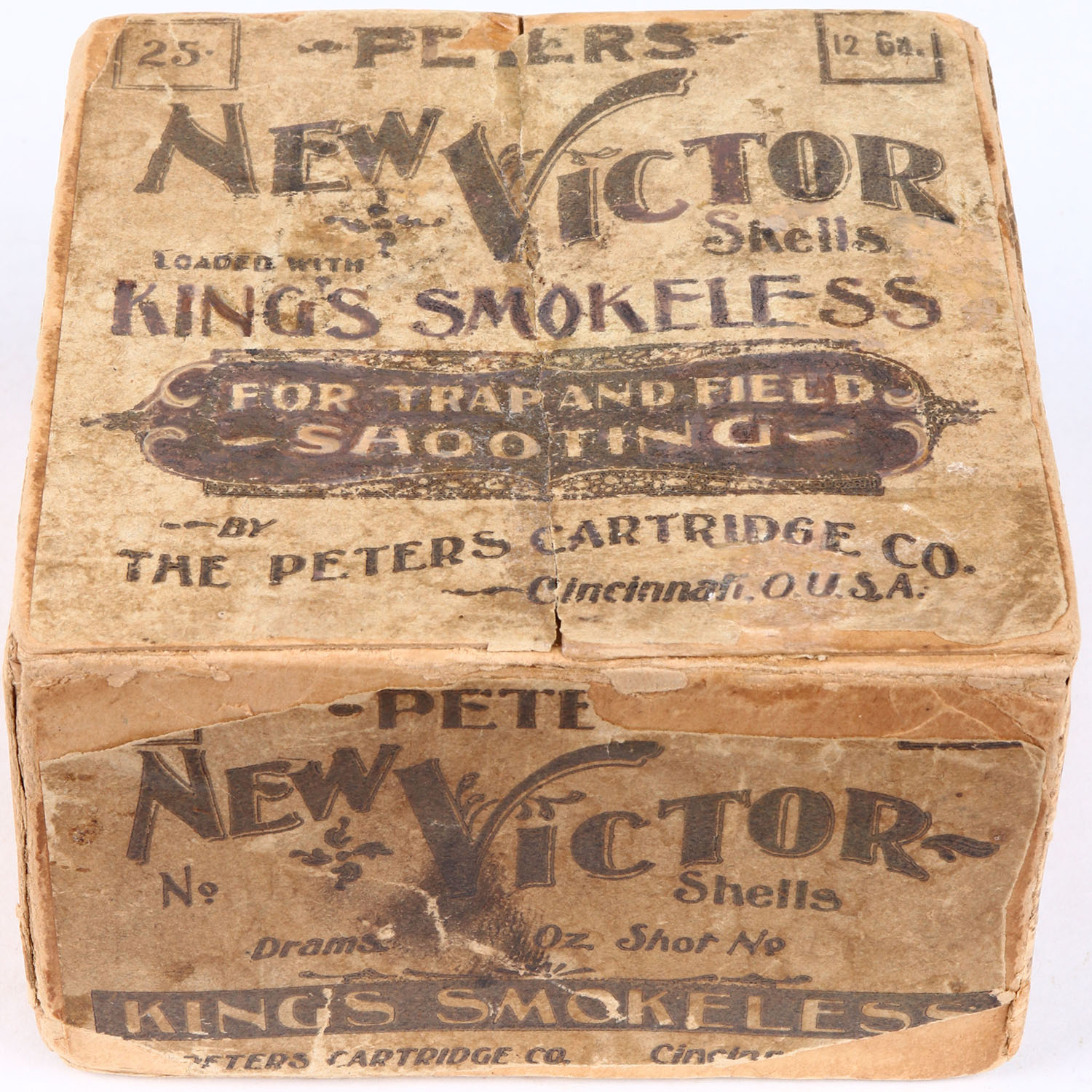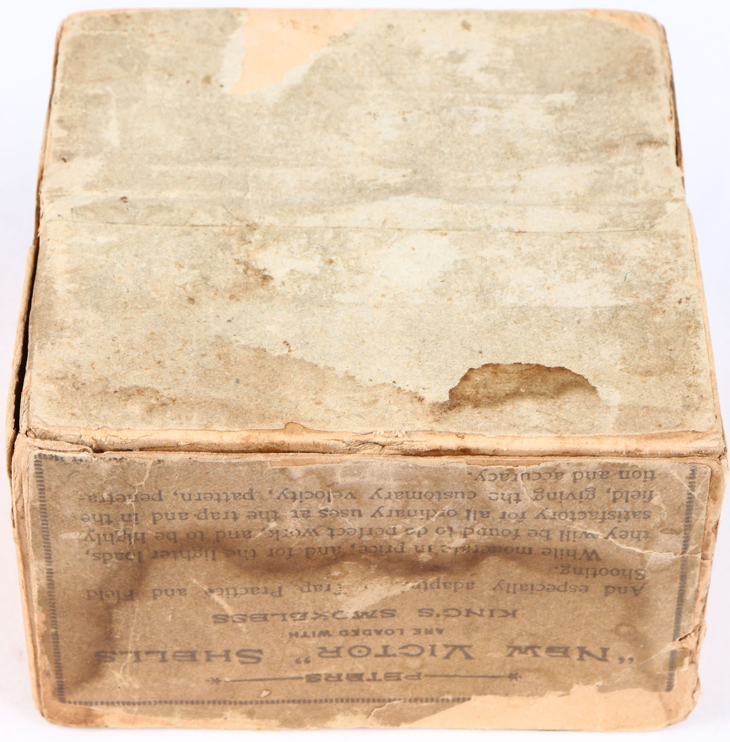 VERY RARE!!! Peters Cart. Co., NEW VICTOR, 12ga., 2pc., KINGS SMOKELESS, For Trap and Field Shooting, Empty, shot size ?, buff box with buff & brown label, box has age soiling with repaired inside seams.* Grade: Very Good ++ - Value: 1000 to 3000