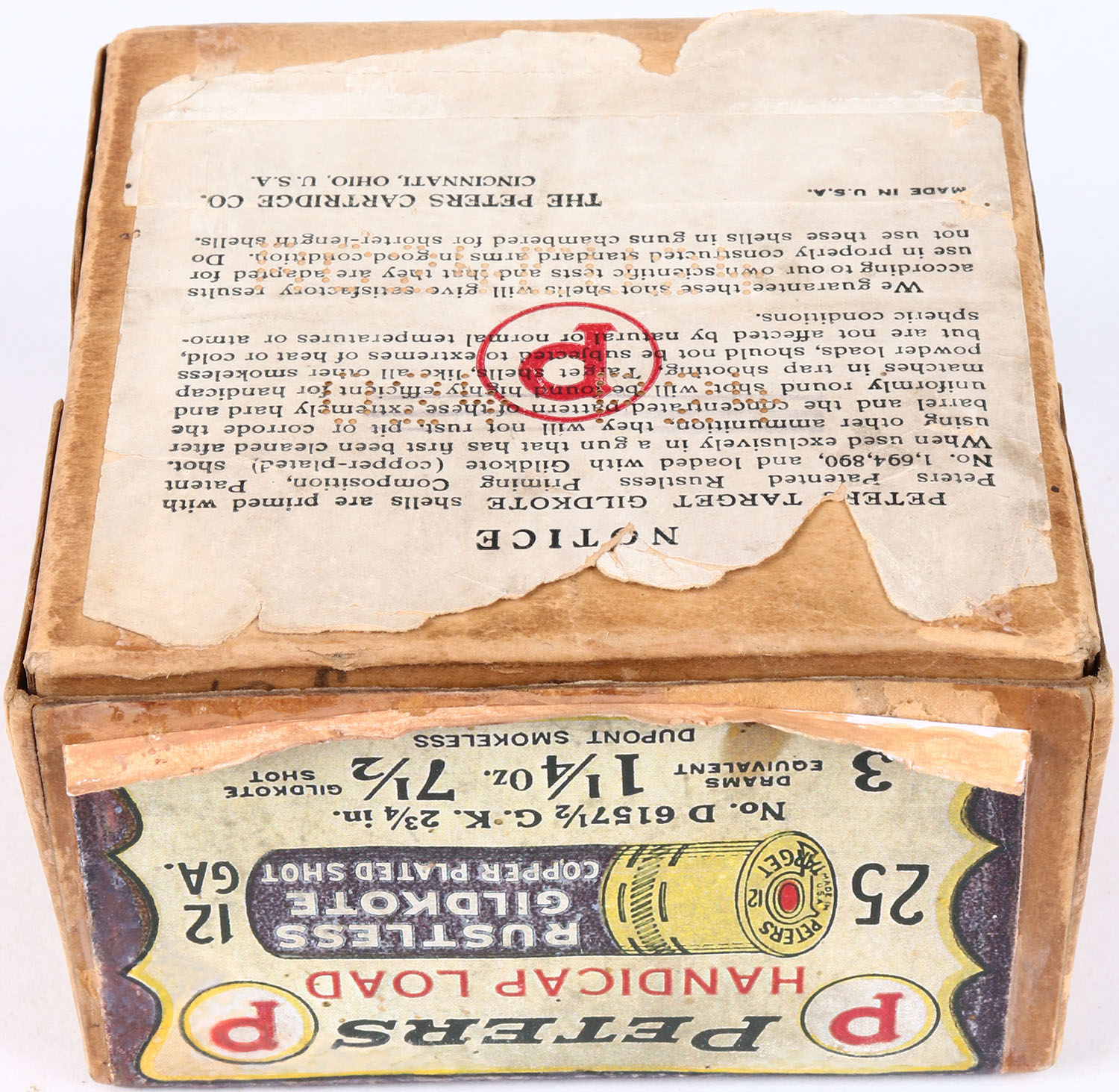 Peters Cart. Co., Target Gildkote, 12ga, 2pc., Empty, shot size 7 1/2 Gildkote Copper Plated Shot, buff box with multi-colored label that has clay pigeon on front, box has light soiling with great color to label, label 100% original.* Grade: Excellent + - Value: 2000 to 4000