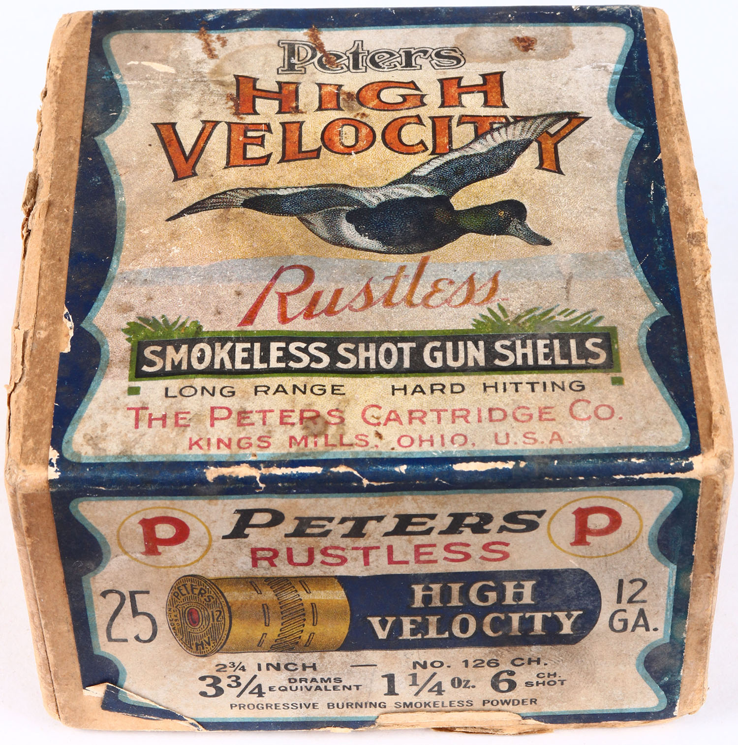 Peters Cart. Co., Blue Bill, 12ga., 2pc., Partial 24rds, shot size 6CH shot, buff box with multi colored label that pictures Blue Bill in flight, box has seam split, shell protrusion, and age soiling with nice colors. Grade: Very Good - Value: 70 to 300
