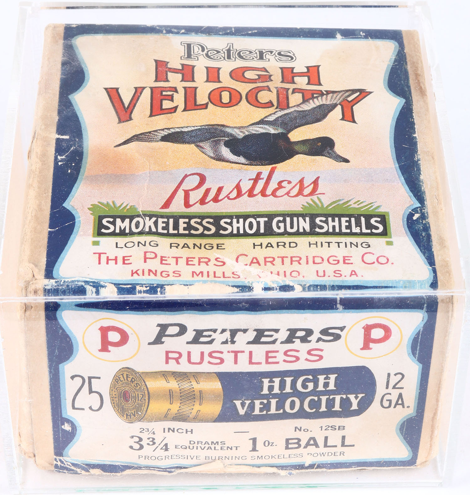Peters Cart. Co., Blue Bill, 12ga., 2pc., Empty, shot size Ball, buff box with multi colored label that pictures Blue Bill in flight, box has scuffing, light soiling & box is solid with very good colors. With acrylic box. Grade: Excellent - Value: 50 to 250