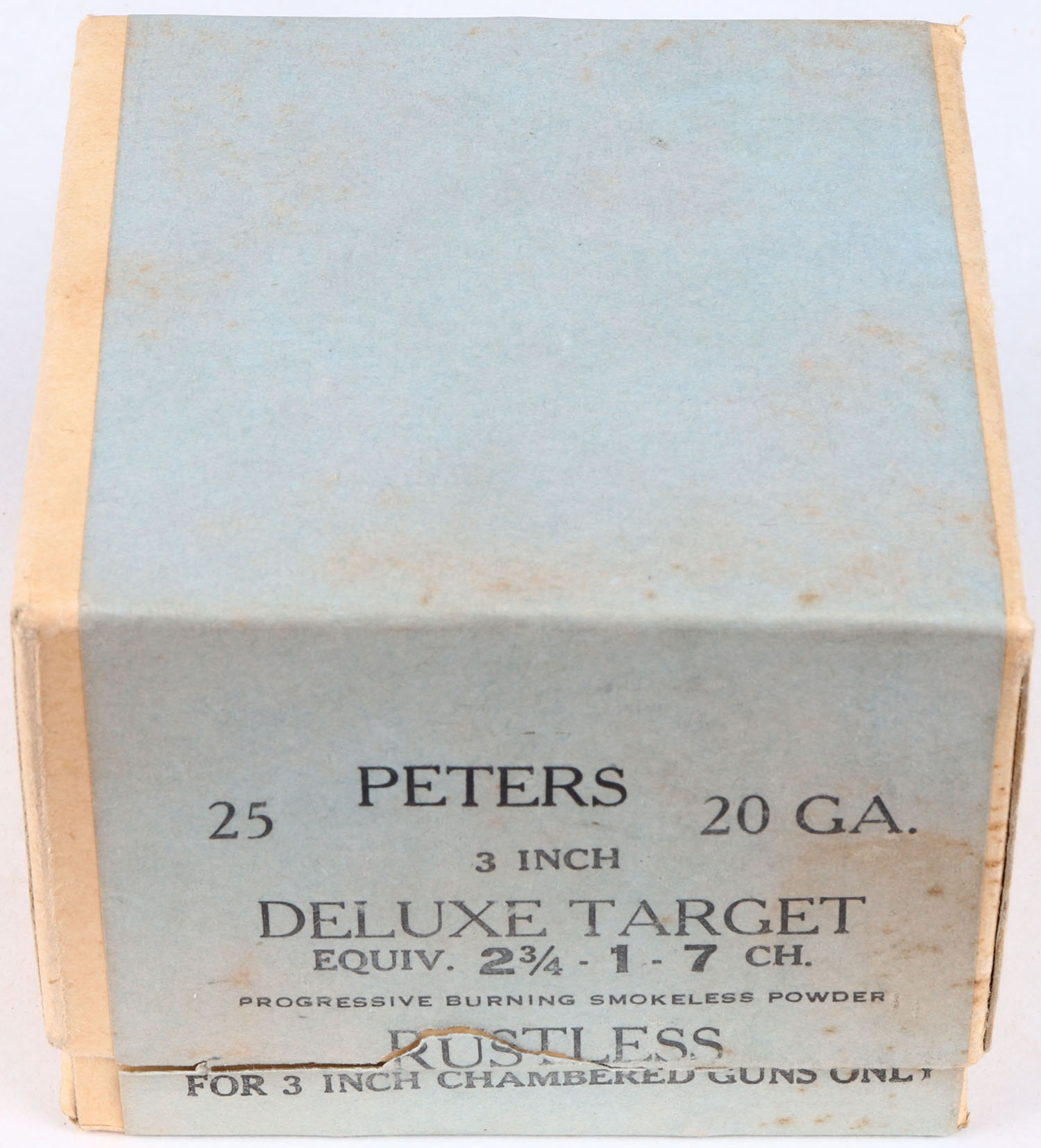 Peters, DELUXE TARGET, 20ga., 2pc., FULL & HALF SEALED, shot size 7CH., buff box with blue & black label, 3 Inch, box has some age soiling. Grade: Excellent ++ - Value: 70 to 300