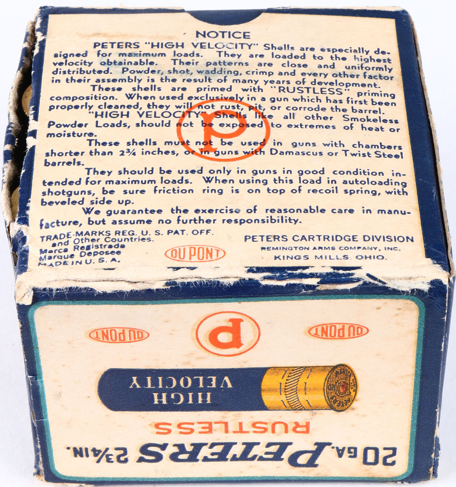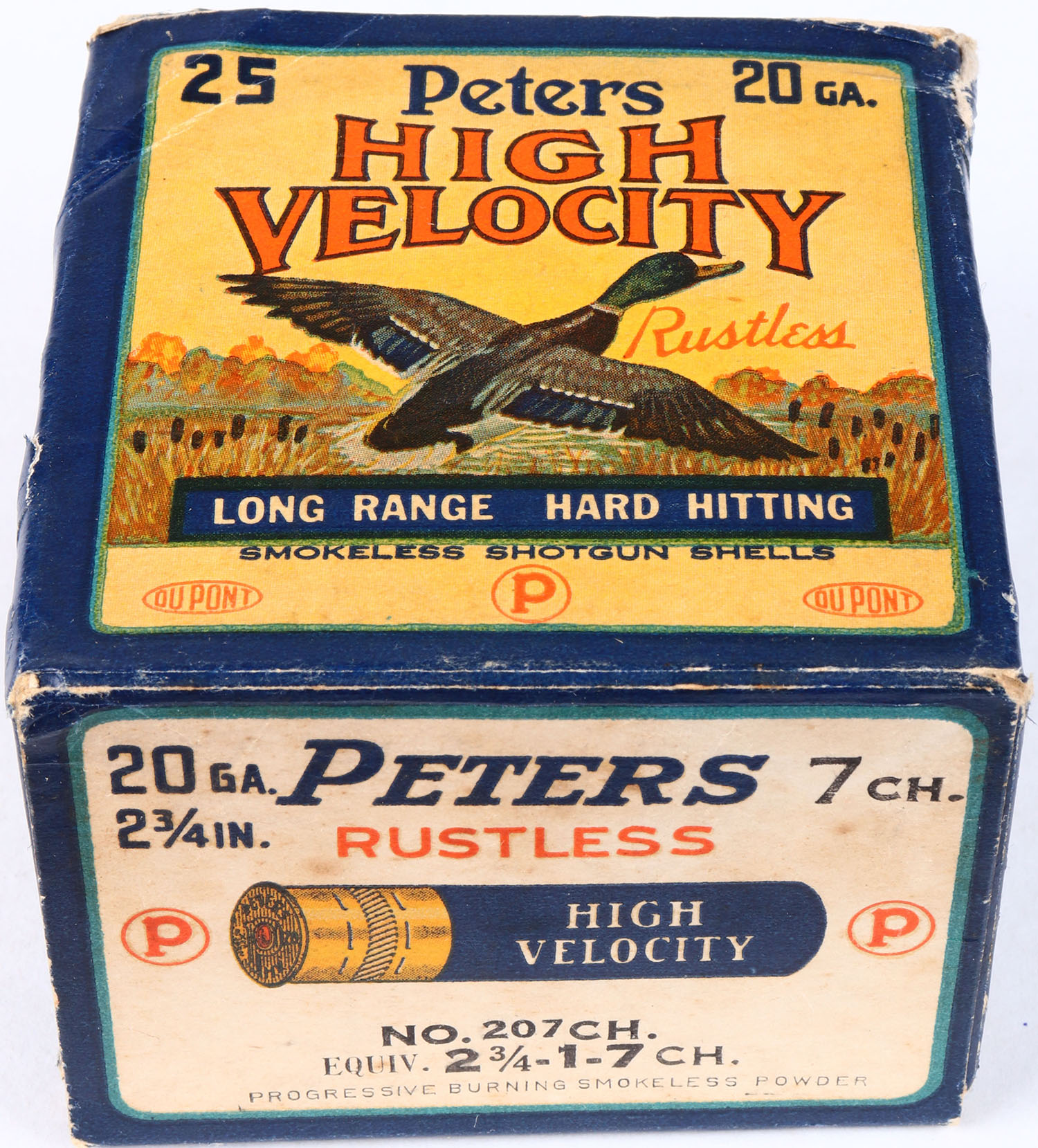 Peters Cart. Co., Kings Mills, OH, High Velocity, 20ga., 1pc., Full, shot size 7CH, multi colored box that pictures mallard flying out of the marsh grass, box is solid with light age soiling, seam split and edge wear nice colors, Shells are very good. Grade: Excellent - Value: 20 to 80