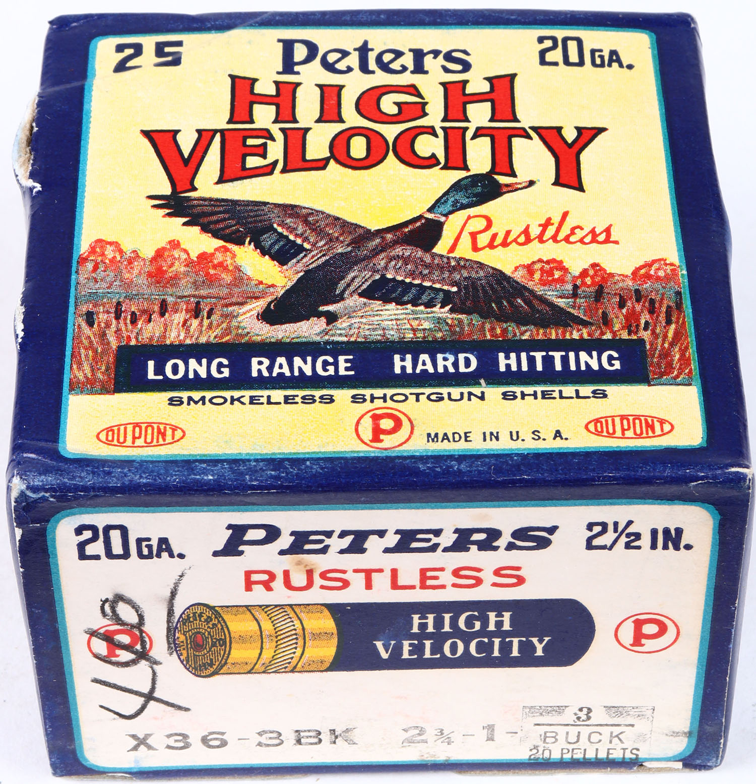 Peters Cart. Co., Bridgeport, CT, High Velocity, 20ga., 1pc., Full, shot size 3 BUCK, multi colored box that pictures mallard flying out of the marsh grass, box is solid with great colors light shell protrusions, shells are excellent. Grade: Excellent ++ - Value: 40 to 100