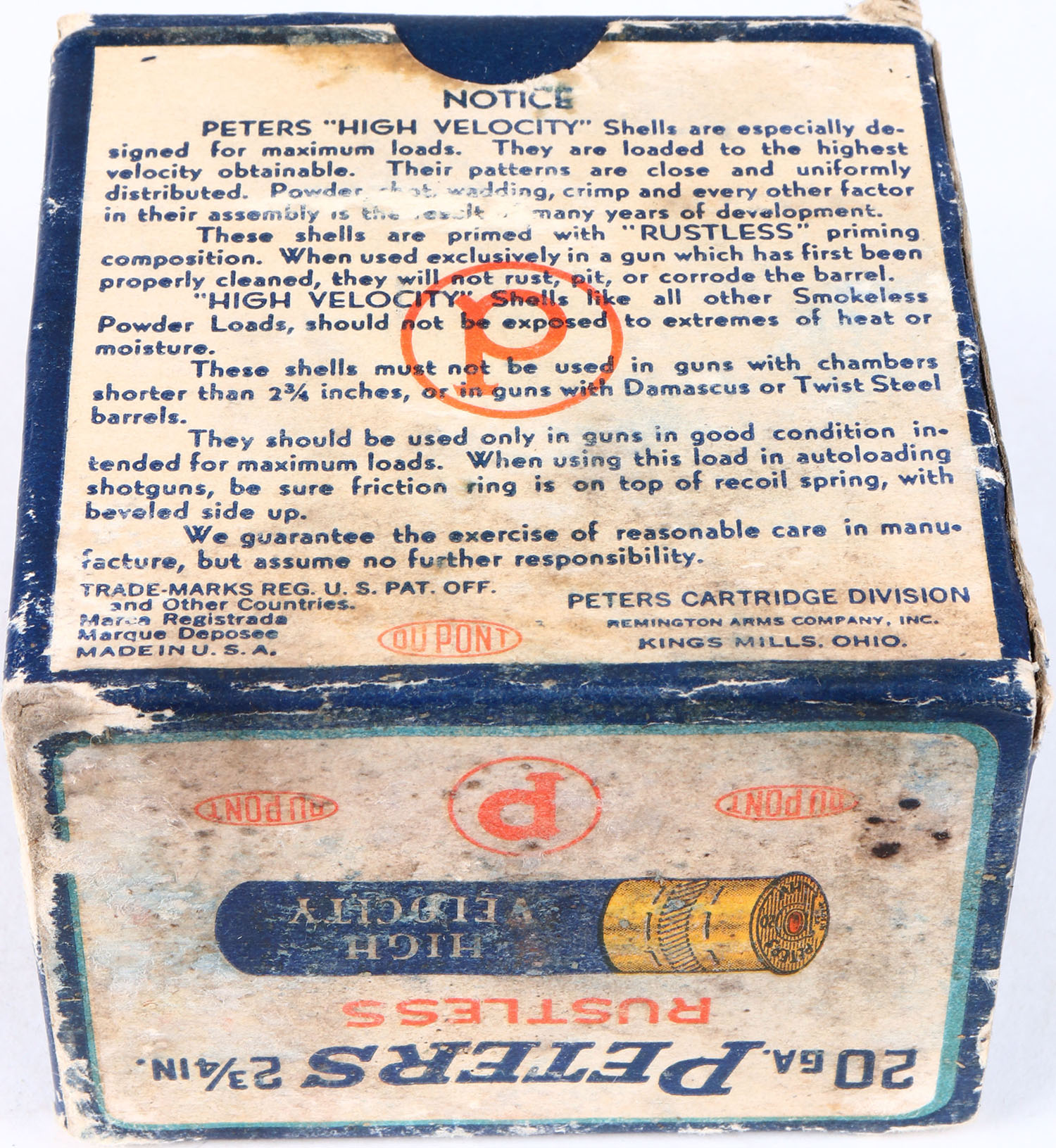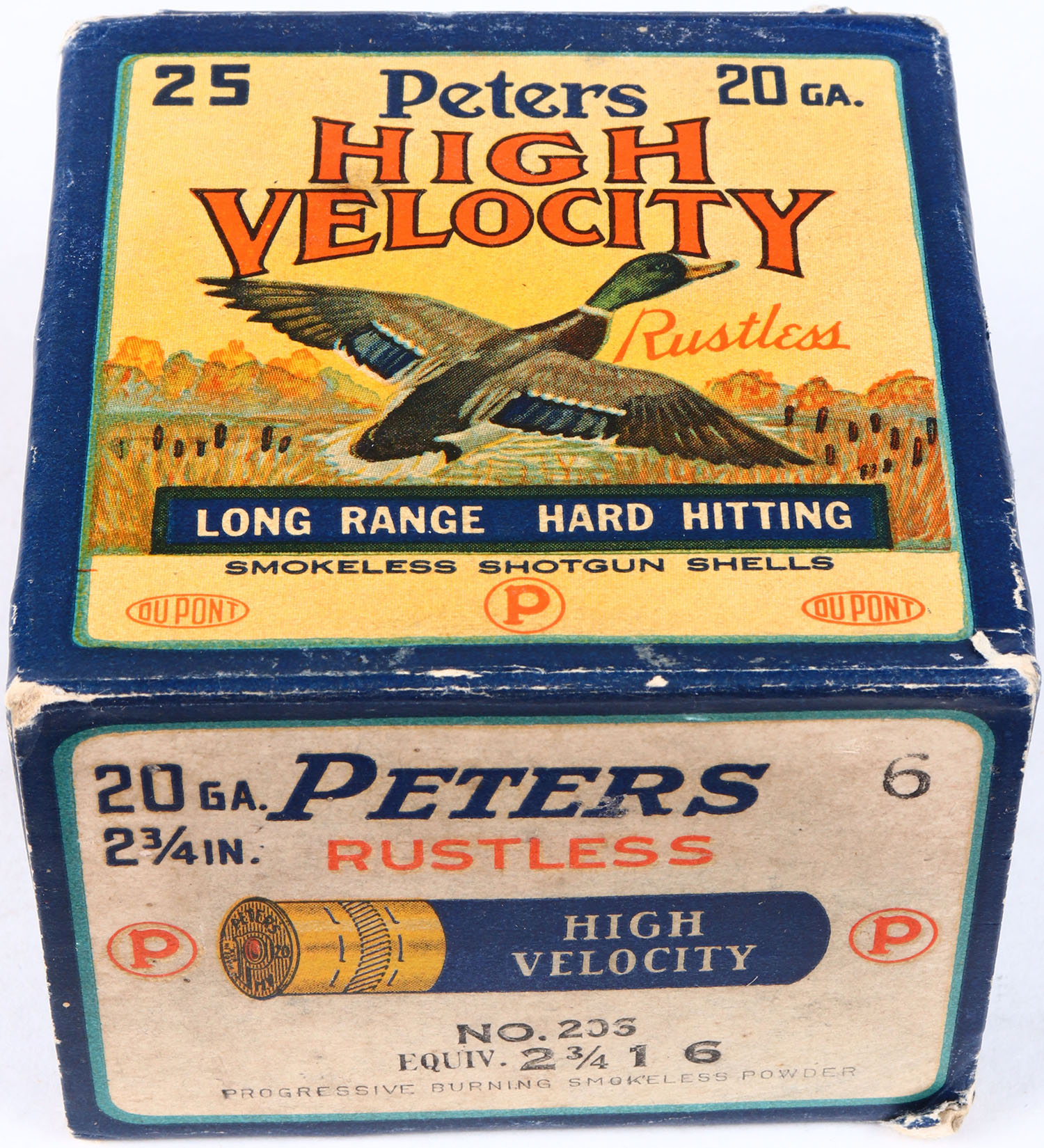 Peters Cart. Co., Kings Mills, OH, High Velocity, 20ga., 1pc., Full, shot size 6, multi colored box that pictures mallard flying out of the marsh grass, box is solid with age soiling, nice color, Shells are very good. Grade: Very Good ++ - Value: 20 to 60