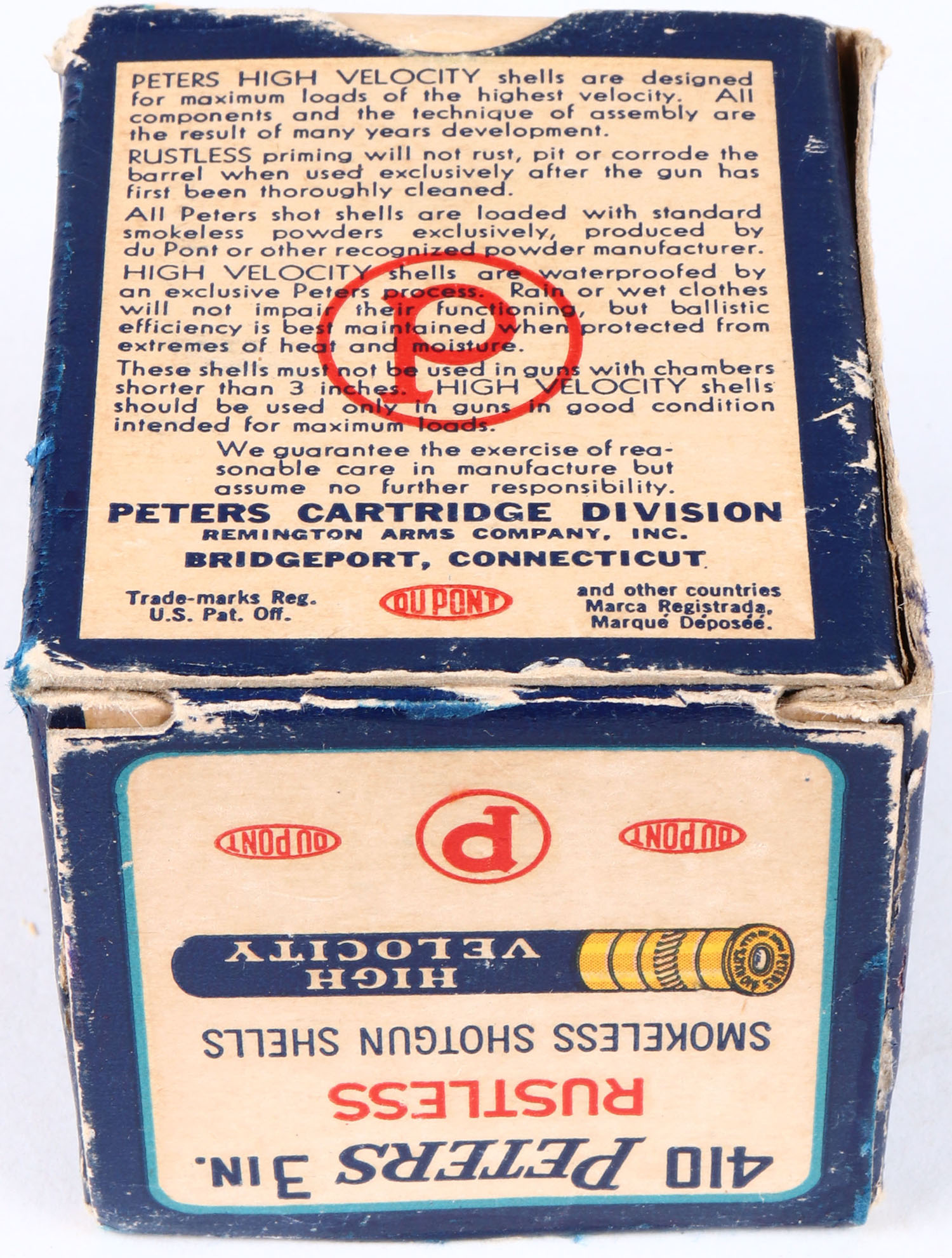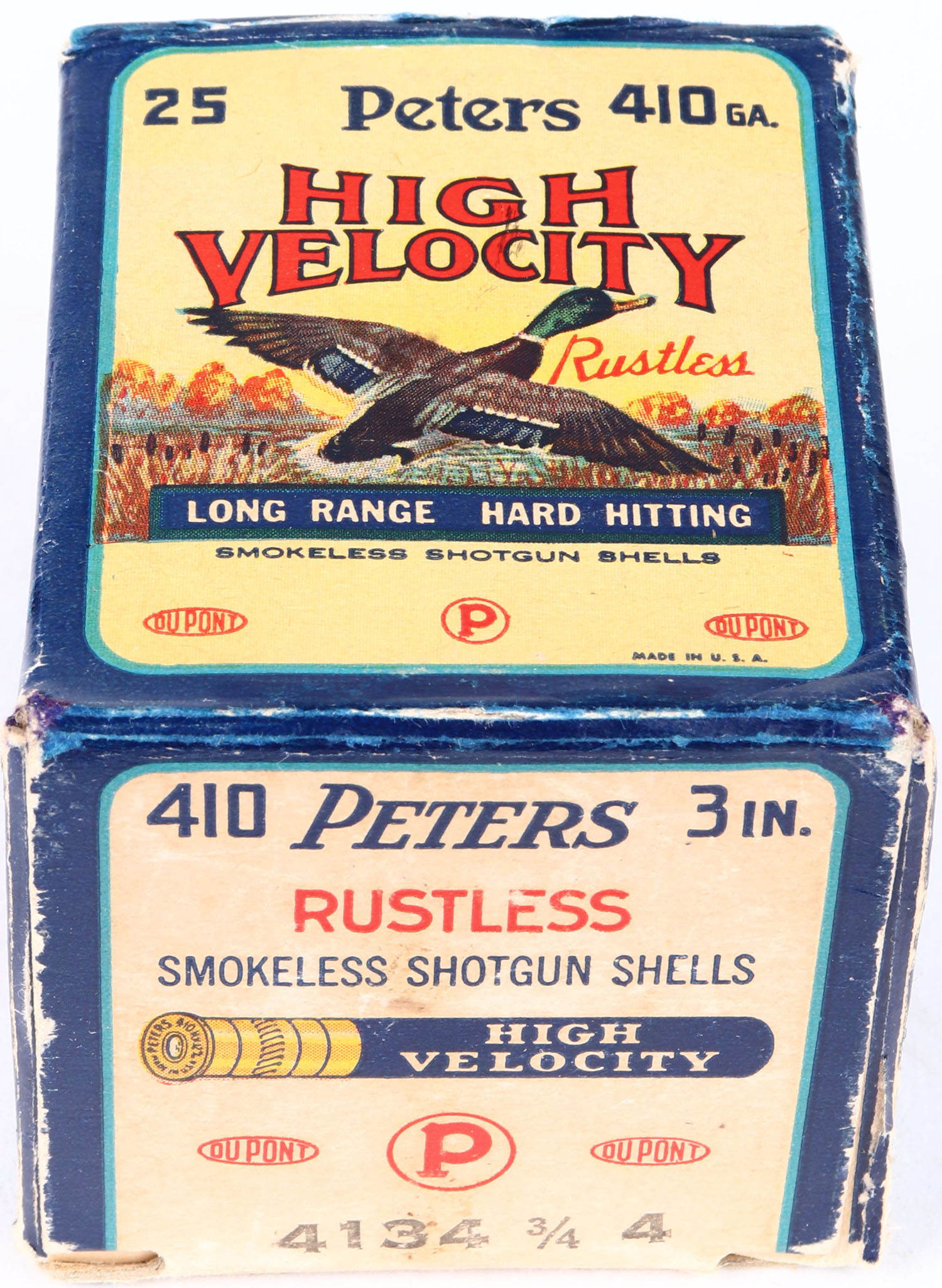 Peters, High Velocity, 410ga., 3 in., 1pc., Full, shot size 4, multi-colored box with mallard duck flying out of marsh grass, box is solid, has light edge wear and inside flap is torn, with excellent colors, shells are excellent. Grade: Excellent + - Value: 30 to 100