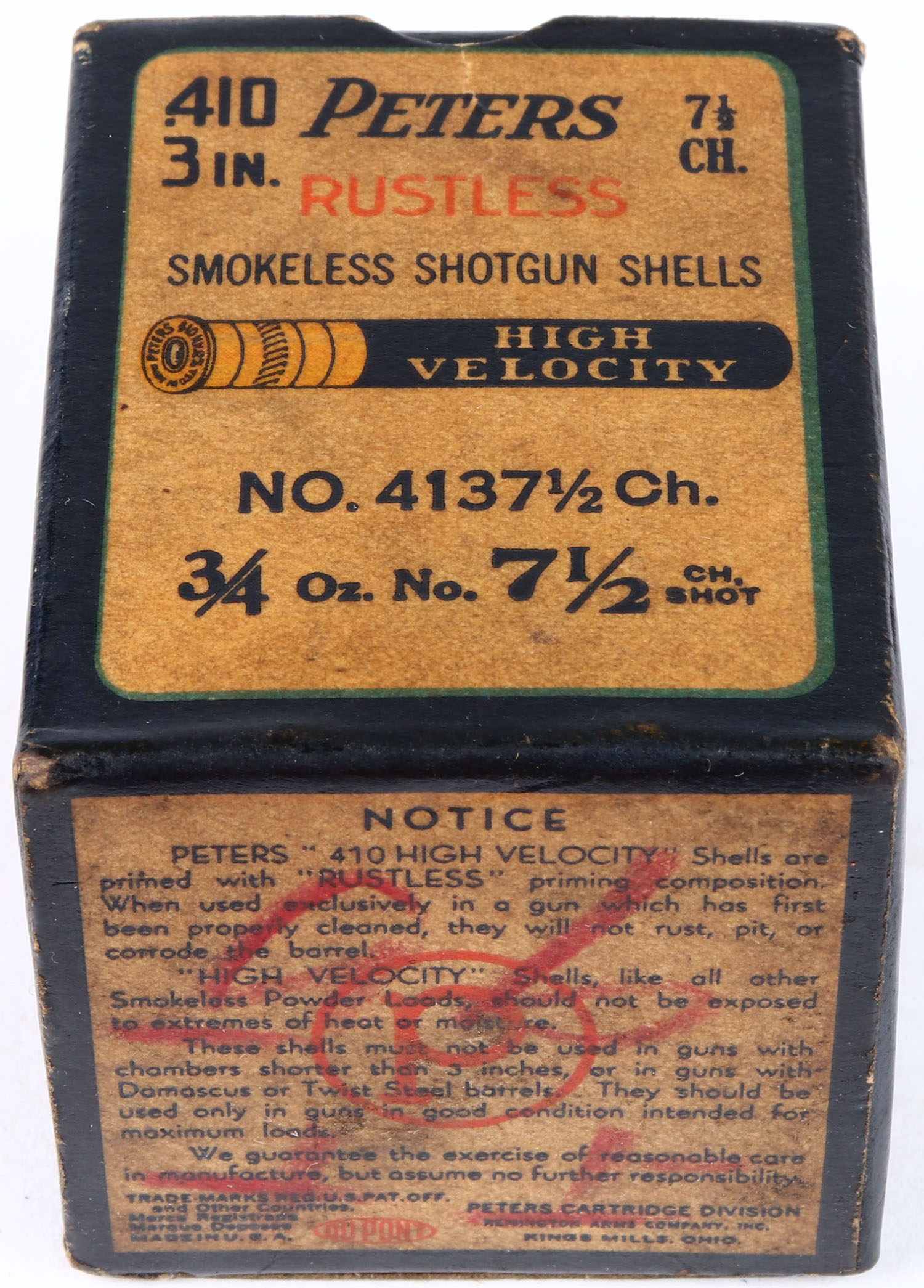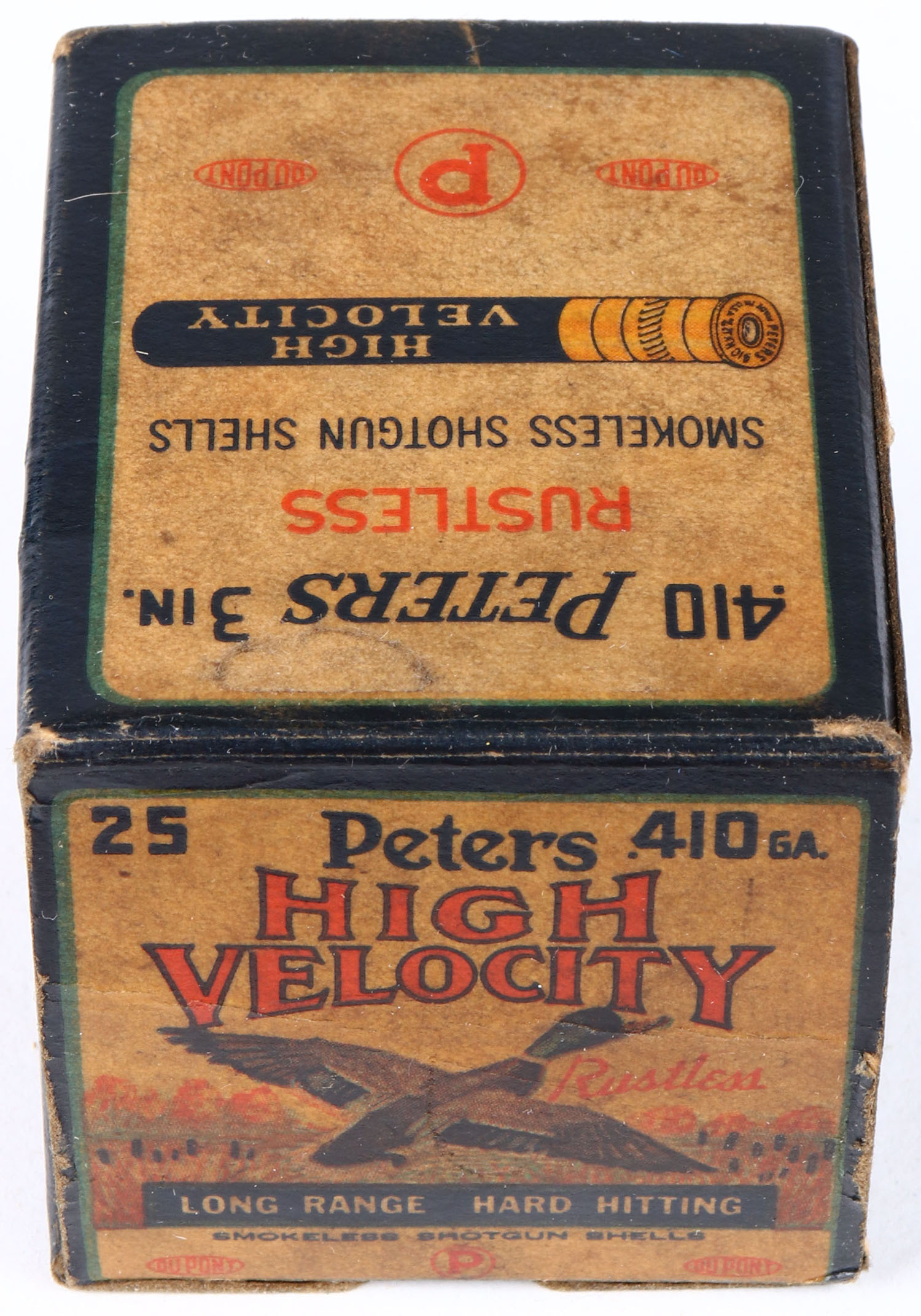 Peters, High Velocity, 410ga., 3 in., 1pc., Full, shot size 7 1/2CH, multi-colored box with mallard duck flying out of marsh grass, box has age soiling and nice colors. Grade: Very Good + - Value: 10 to 50