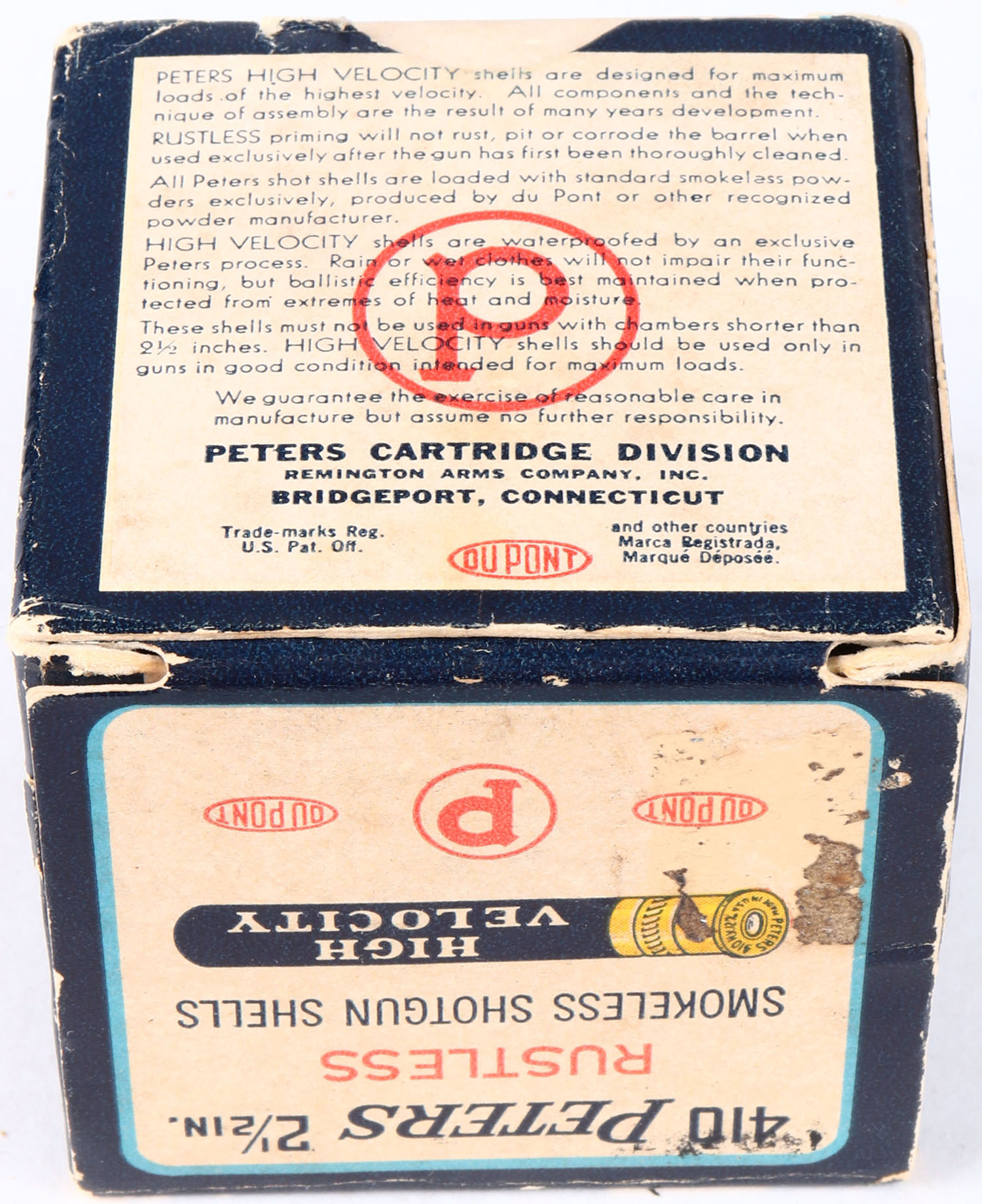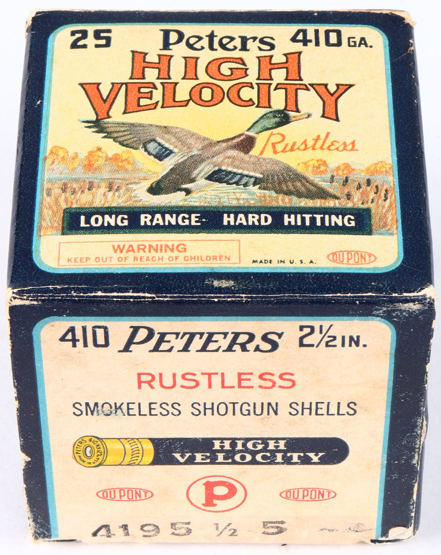 Peters, High Velocity, 410ga., 2 1/2''., 1pc., Full, shot size 5, multi-colored box with mallard duck flying out of marsh grass, box is solid, with excellent colors, shells are excellent. Grade: Excellent ++ - Value: 30 to 100