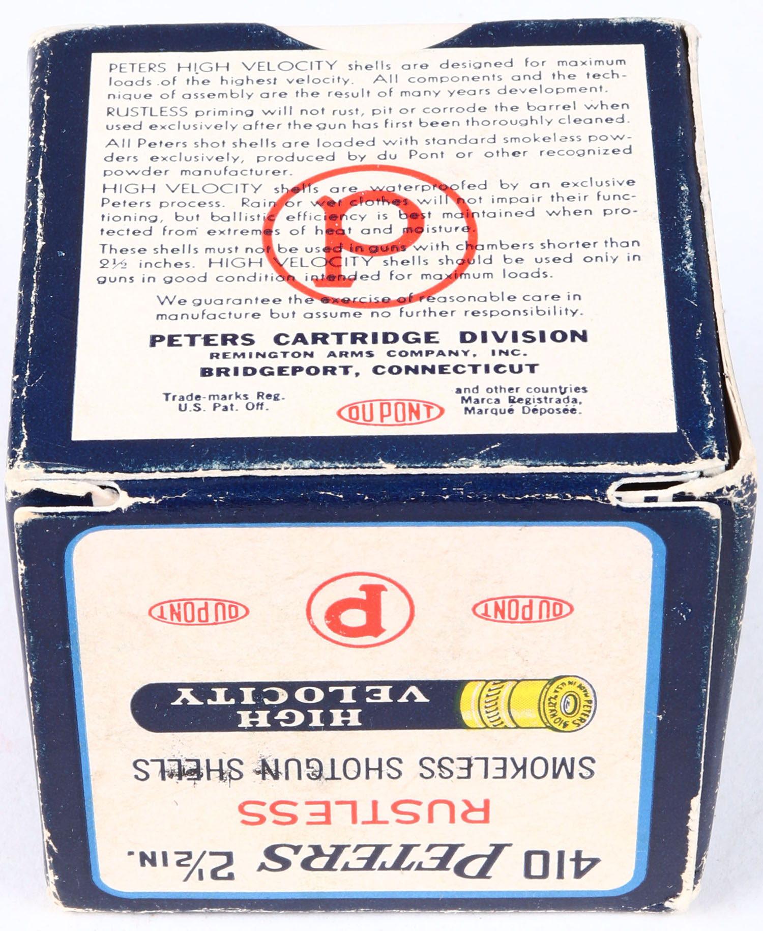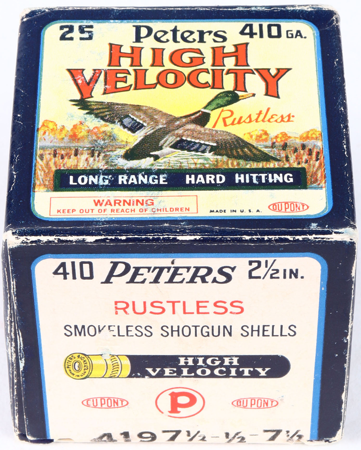 Peters, High Velocity, 410ga., 2 1/2 in., 1pc., Full, shot size 7 1/2, multi-colored box with mallard duck flying out of marsh grass, box is solid with great colors, shells are excellent. Grade: Excellent + - Value: 20 to 100